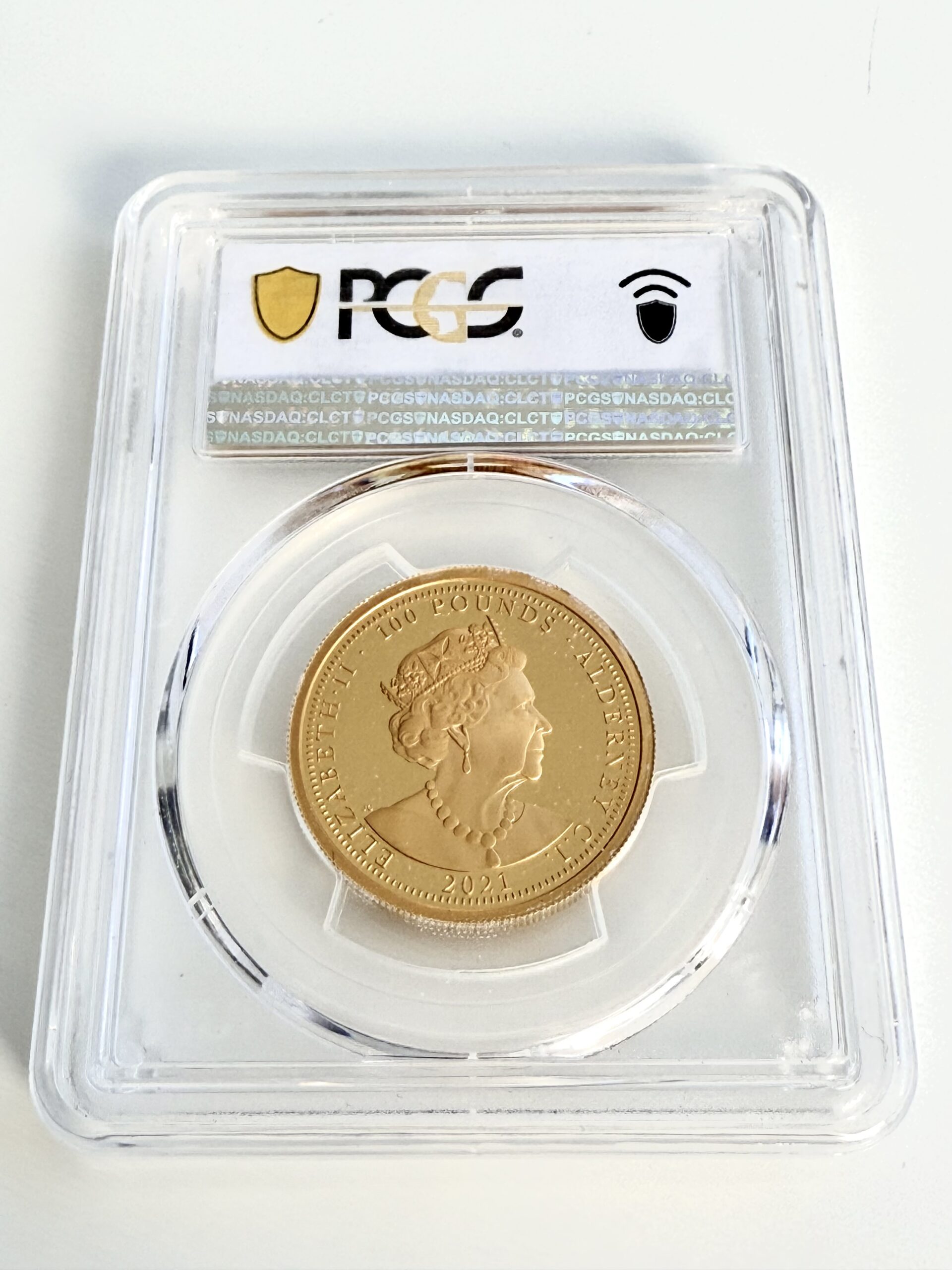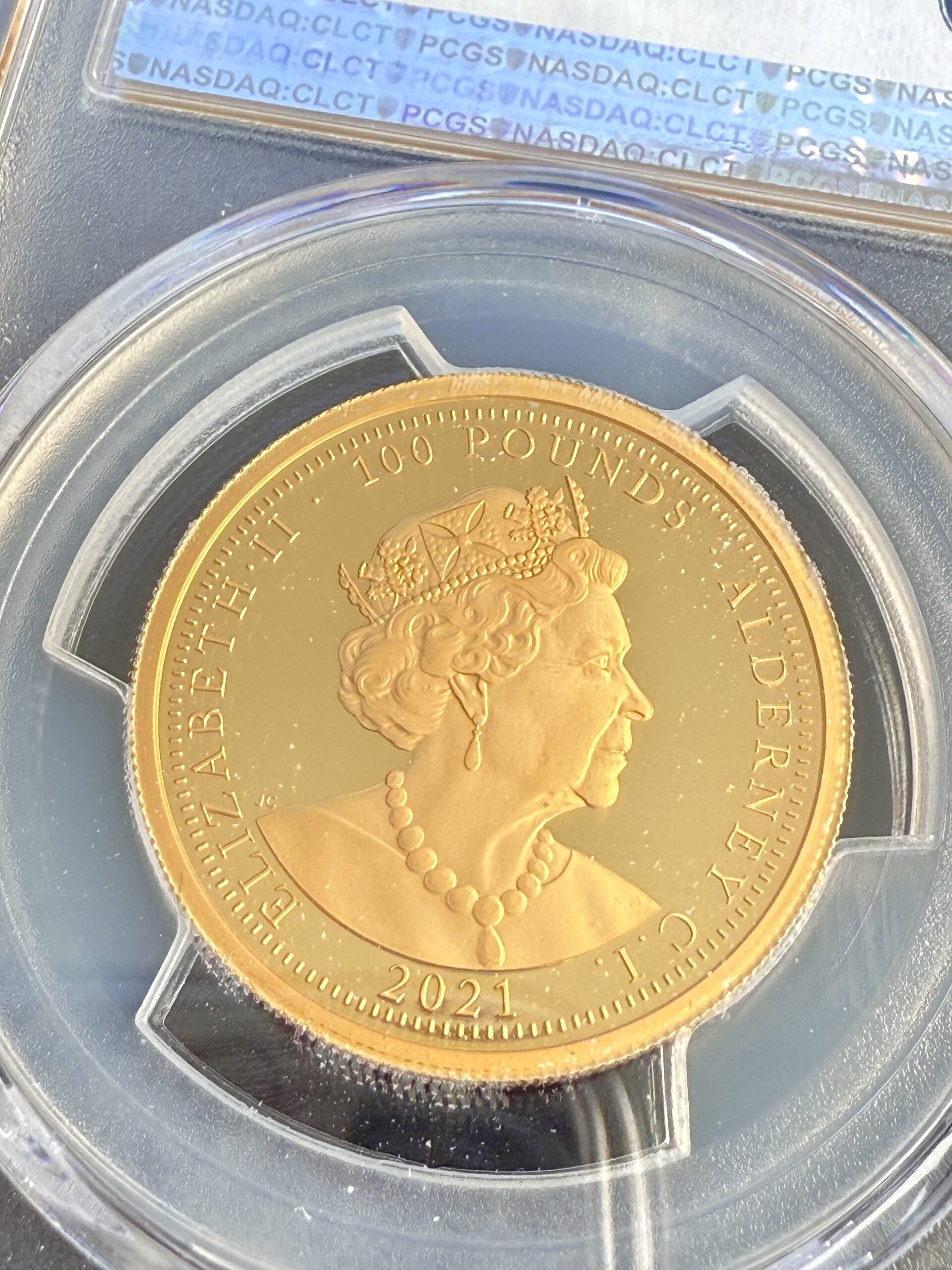 Die Wertseite zeigt ein elegantes Porträt von Königin Elizabeth II., wie gewohnt umgeben von der Inschrift „ELIZABETH II · ALDERNEY · 2021 · 100 POUNDS“.