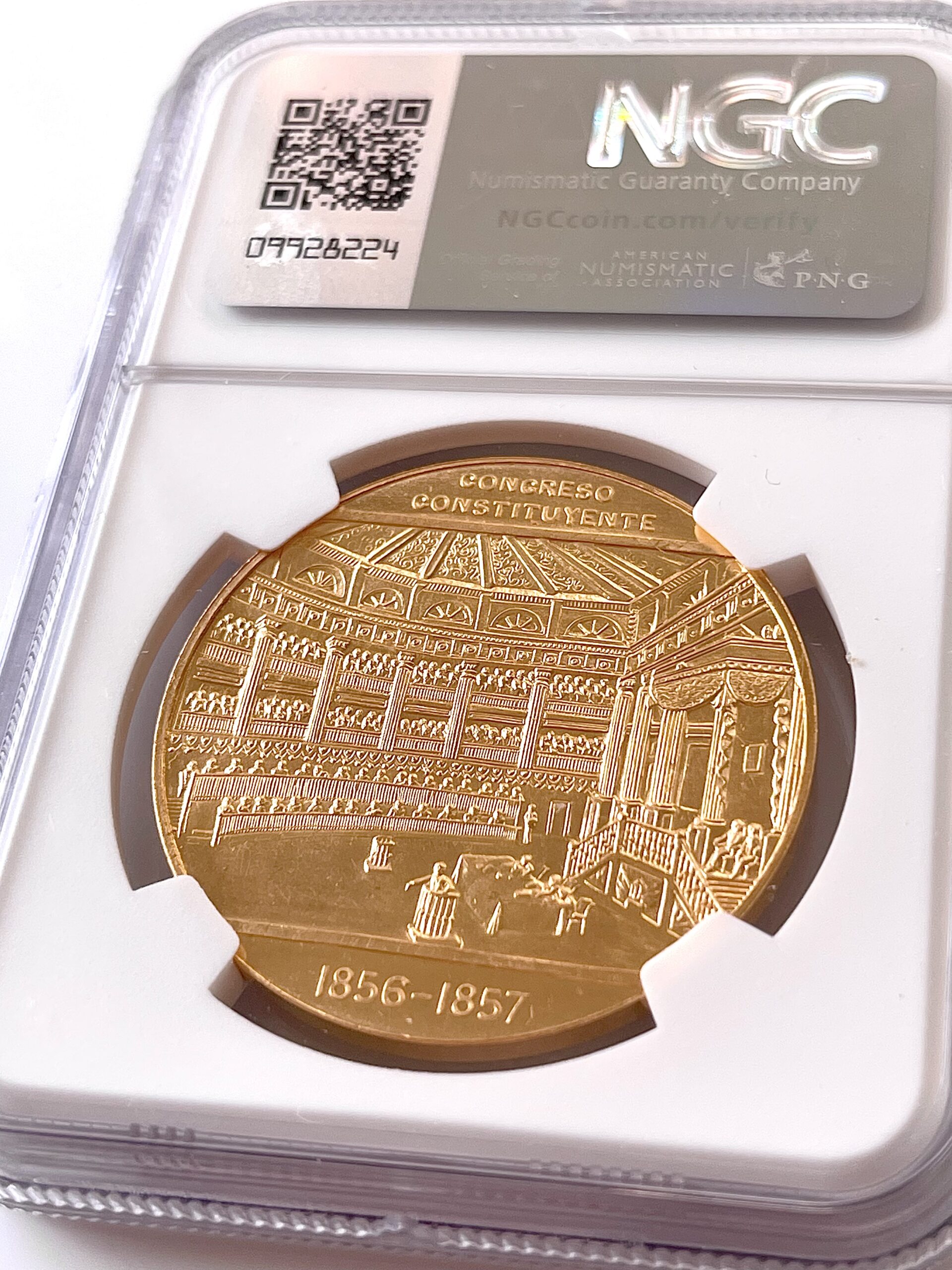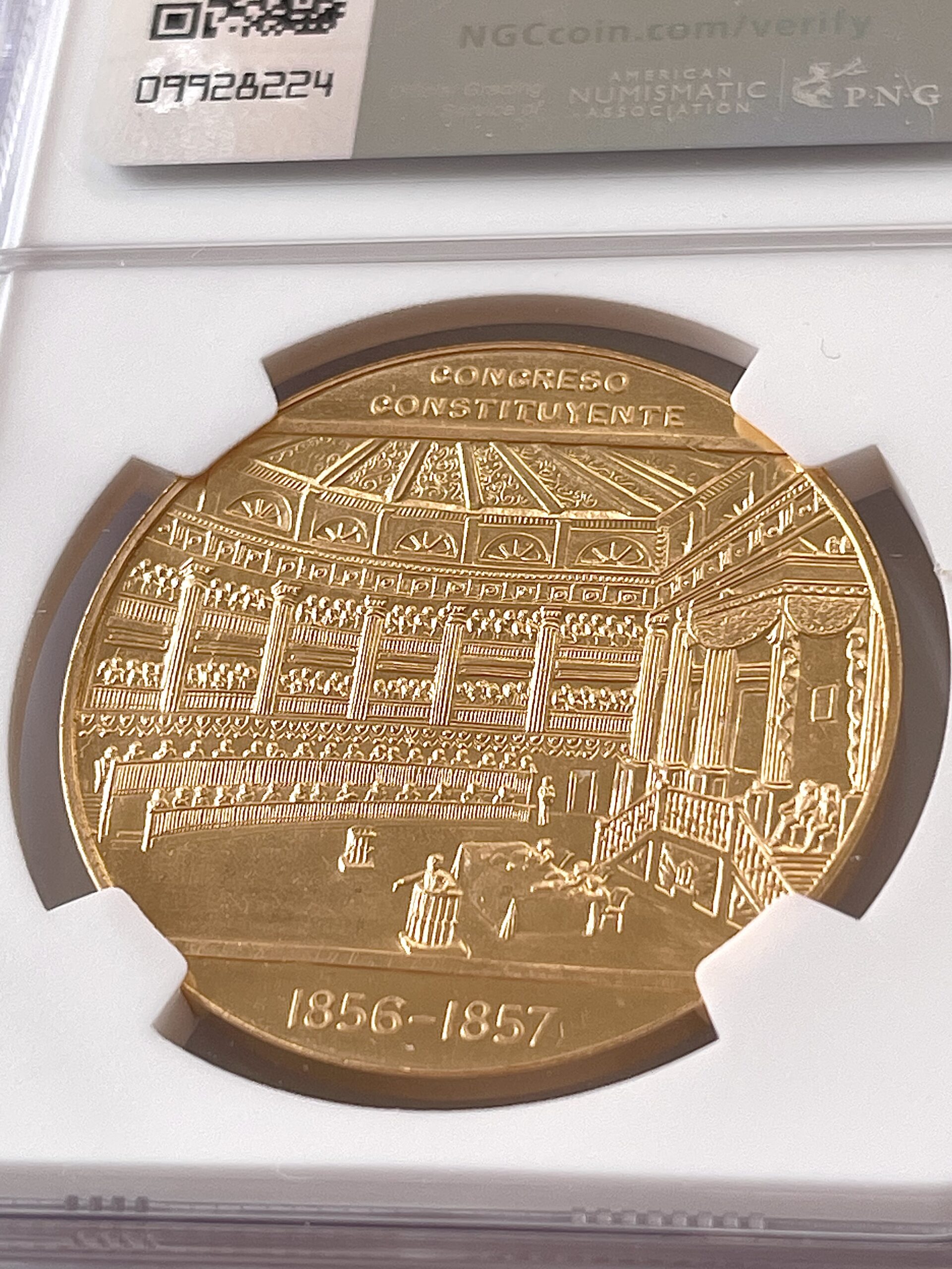 Die Rückseite der Goldmedaille zeigt die Versammlungshalle des Verfassungskongresses von 1856-1857, die in mehrdimensionalen Details abgebildet ist. Die Inschrift oben in der Mitte lautet „CONGRESO CONSTITUYENTE“, und unten in der Mitte ist „1856-1857“ eingraviert.
