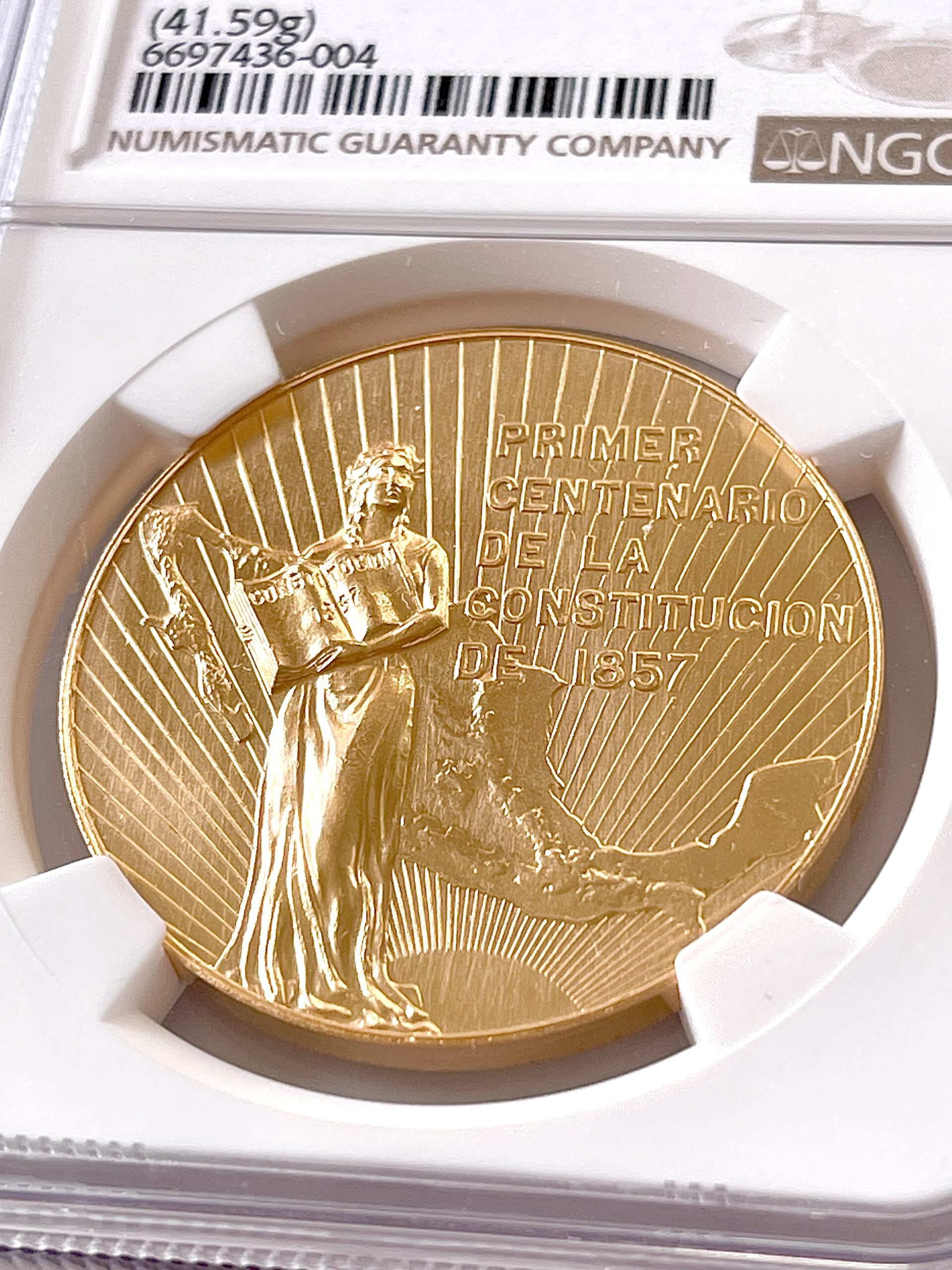 Auf der Vorderseite der Goldmedaille steht eine weibliche Figur in einem Gewand, welche ein Buch mit der Aufschrift „CONSTITUCION 1857“ hält. Hierbei sieht man auch die Landkarte von Mexiko im Hintergrund. Die Aufschrift auf der rechten Seite der weiblichen Figur lautet „PRIMER CENTENARIO DE LA CONSTITUCION DE 1857“ (was bedeutet: „erstes Jahrhundert der Verfassung von 1857“).