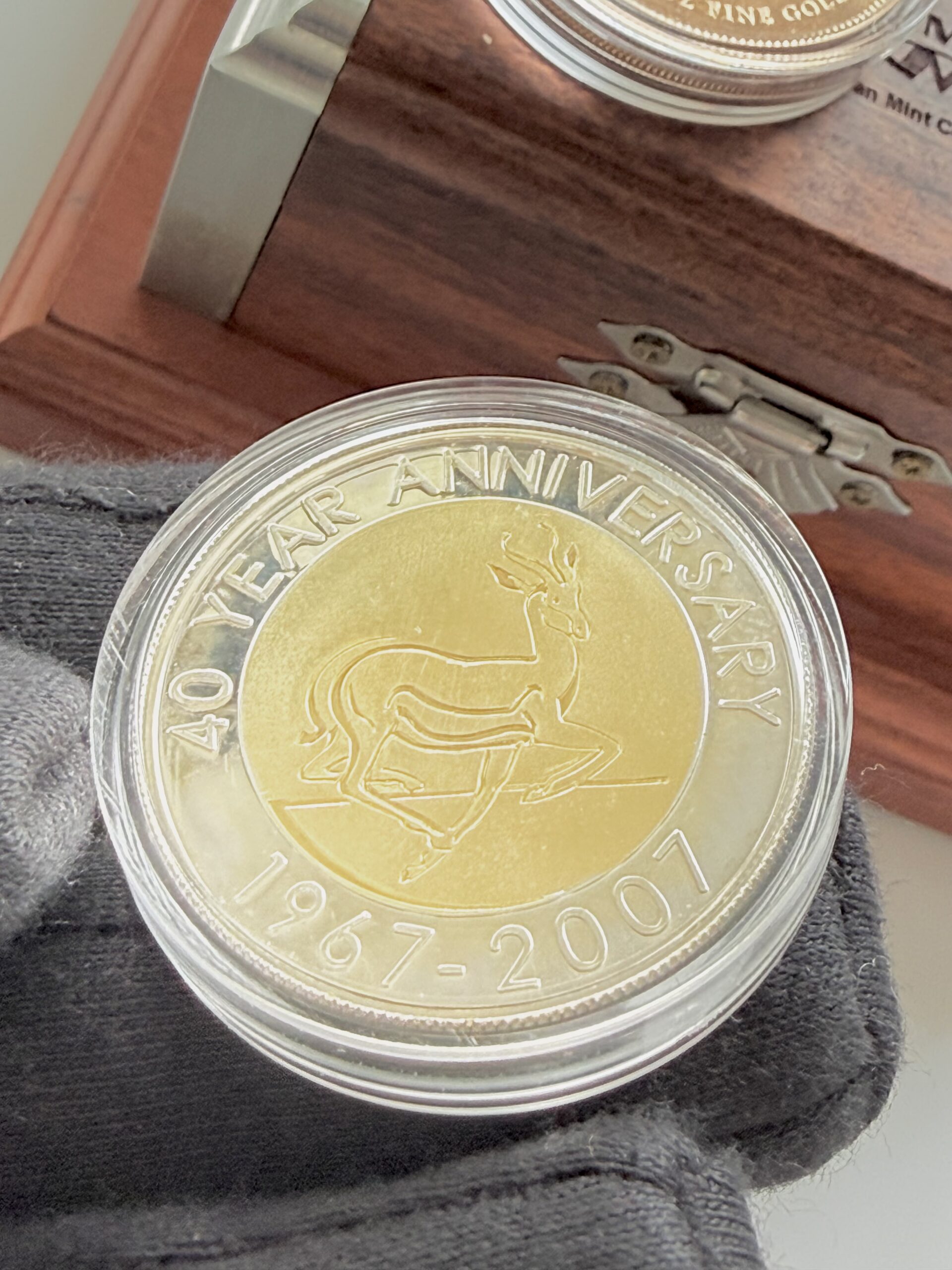 Südafrika – 2007 – 1 Krügerrand – 40 Jahre Jubiläum Launch Set – Springbok 40 Years Privy Mark – Gold – Proof – Medaille Dr. Diedericks – Holzbox – COA