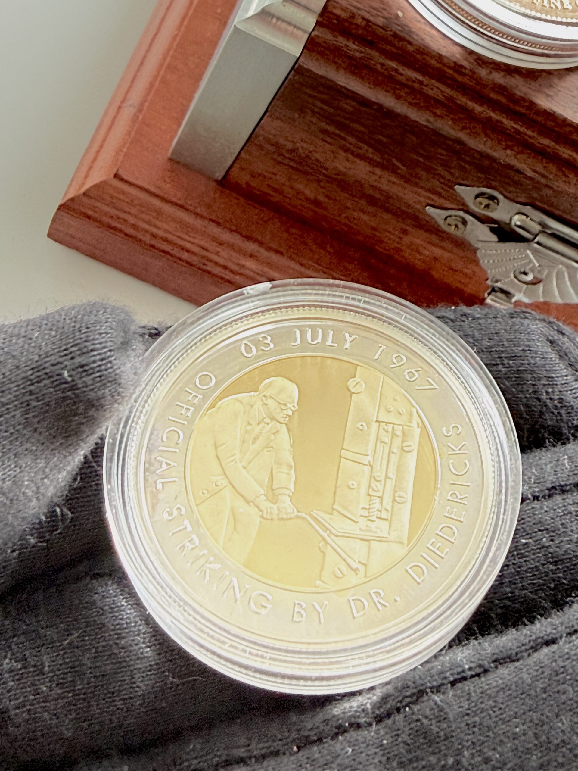 Darüber hinaus ergänzt die Medaille den historischen Kontext, und zwar sehr konkret: Eine Seite zeigt das Jubiläum „40 Year Anniversary 1967-2007“ mit Springbok-Motiv, während die andere Seite die Erstprägung am „03 July 1967“ thematisiert und Dr. Diedericks als offiziellen Erstprägende nennt. Dadurch wirkt das Set nicht nur hochwertig, sondern zugleich auch inhaltlich geschlossen, weshalb es bei Krügerrand-Sammlern deutlich stärker gefragt ist als ein normaler Jahrgang.
