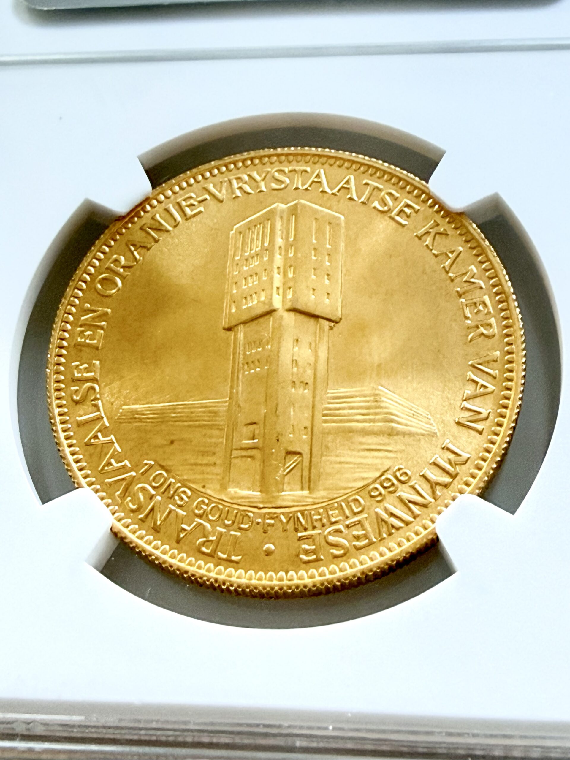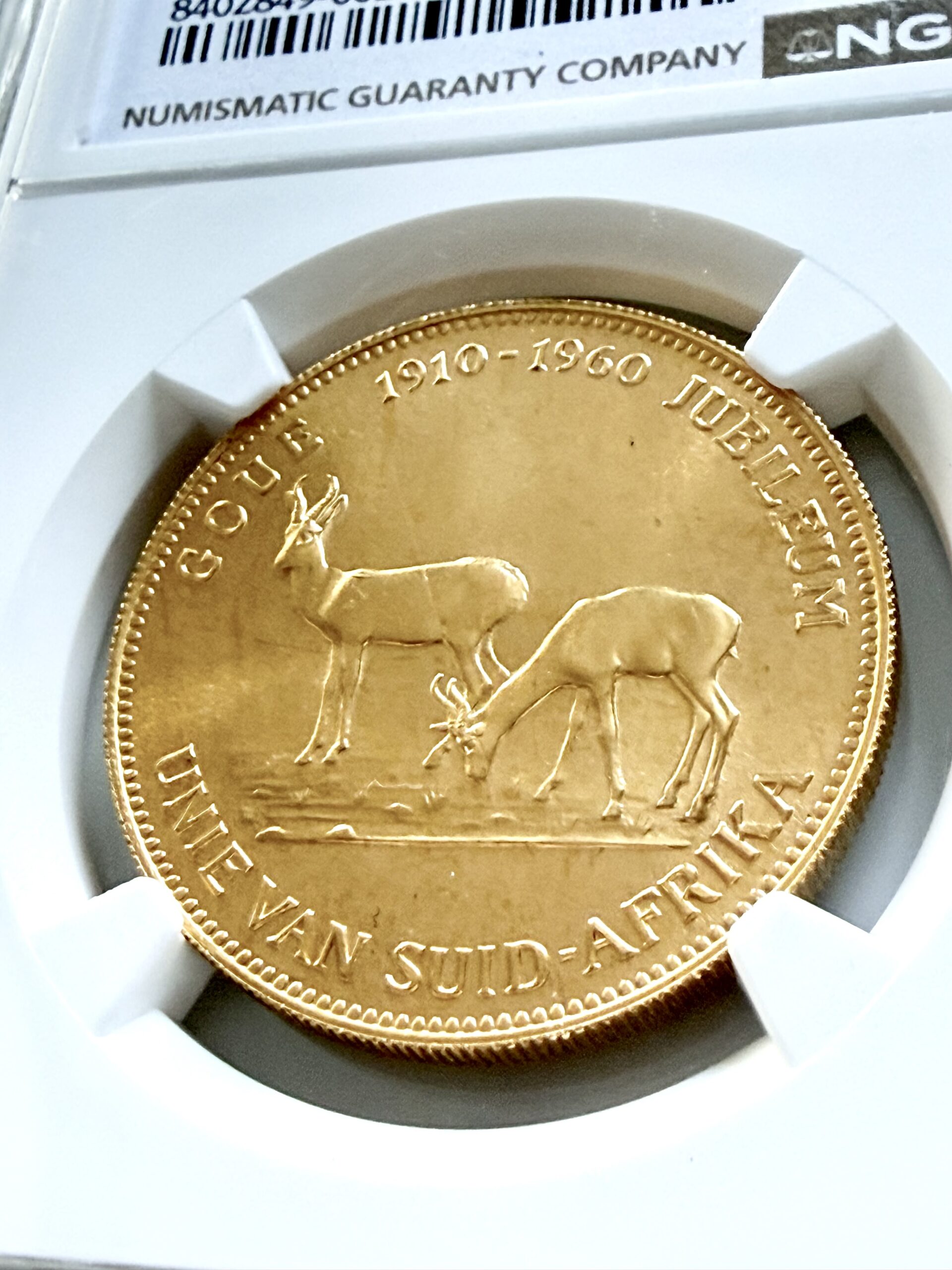 This impressive 1oz gold coin was minted in 1960 by the Transvaal and Orange Free State Chamber of Mines to commemorate the 50th anniversary of the Union of South Africa (1910-1960). It is considered by experts to be one of the most important precursors to the later Krugerrand concept, as it already combines a full ounce of fine gold, the iconic springbok motif, and a clear export focus.