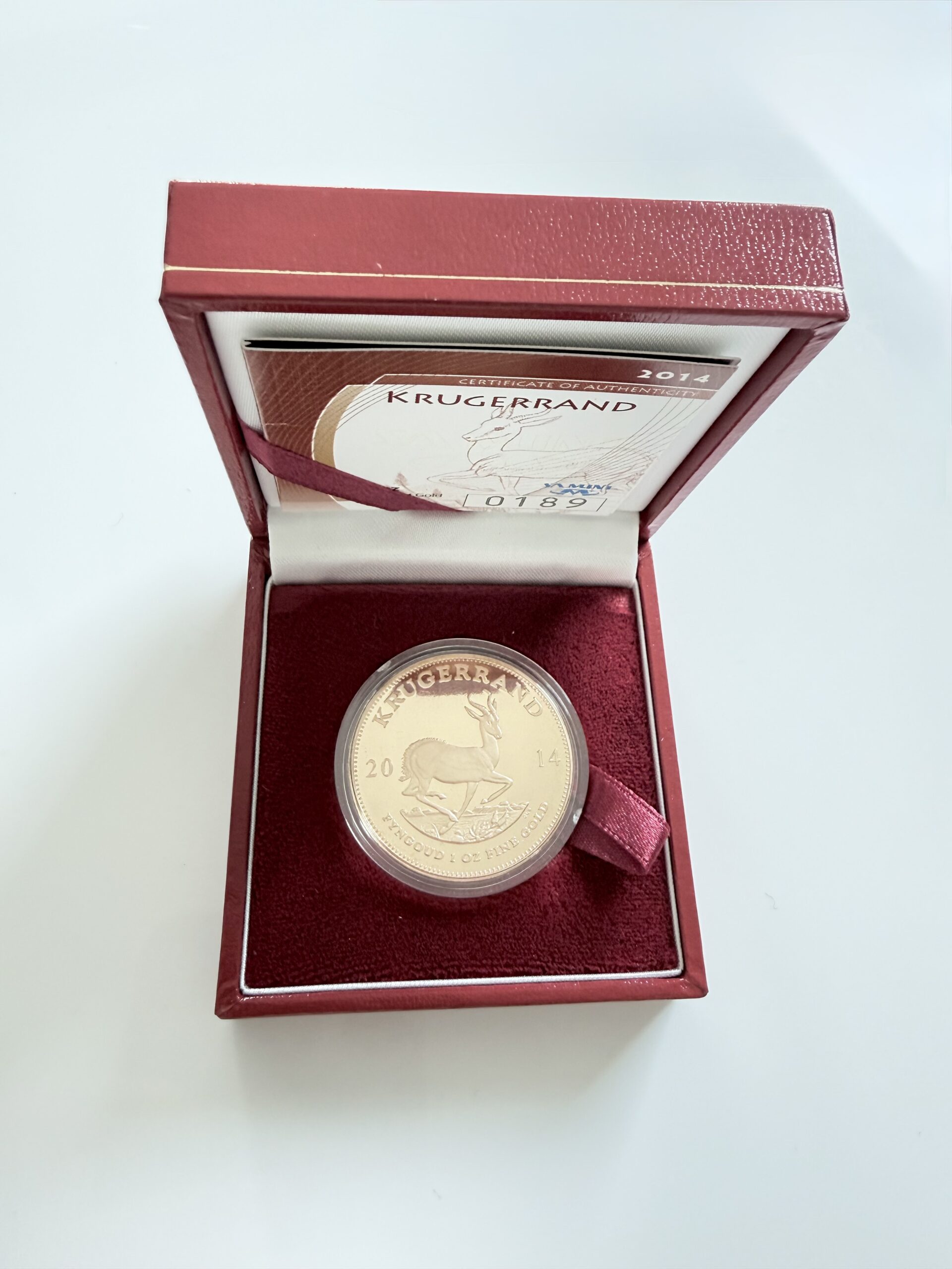 On the obverse, the springbok, a national symbol, leaps across a typical South African landscape. The image is complemented by the year 2014 and the inscription “FYNGOUD 1 OZ FINE GOLD,” clearly indicating the 1-oz fine gold component. The reverse features a portrait of Paul Kruger with the inscription “SUID-AFRIKA – SOUTH AFRICA,” ensuring the Krugerrand retains its distinctive character, whether viewed as an investment or a collector’s item.