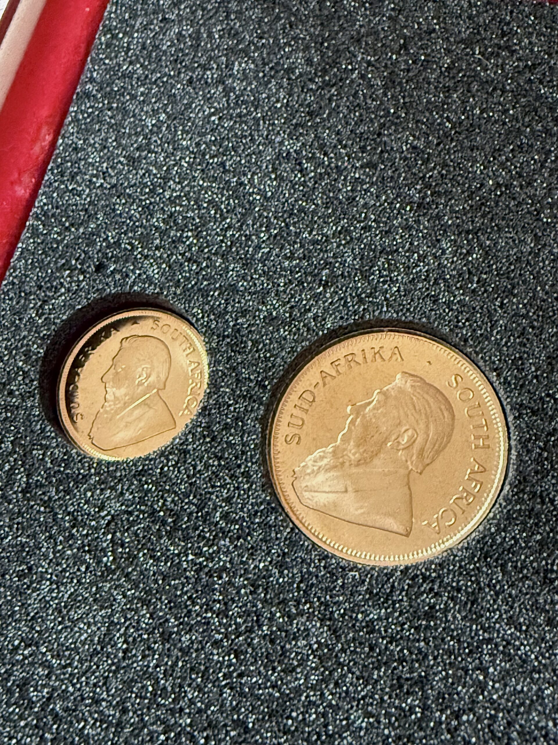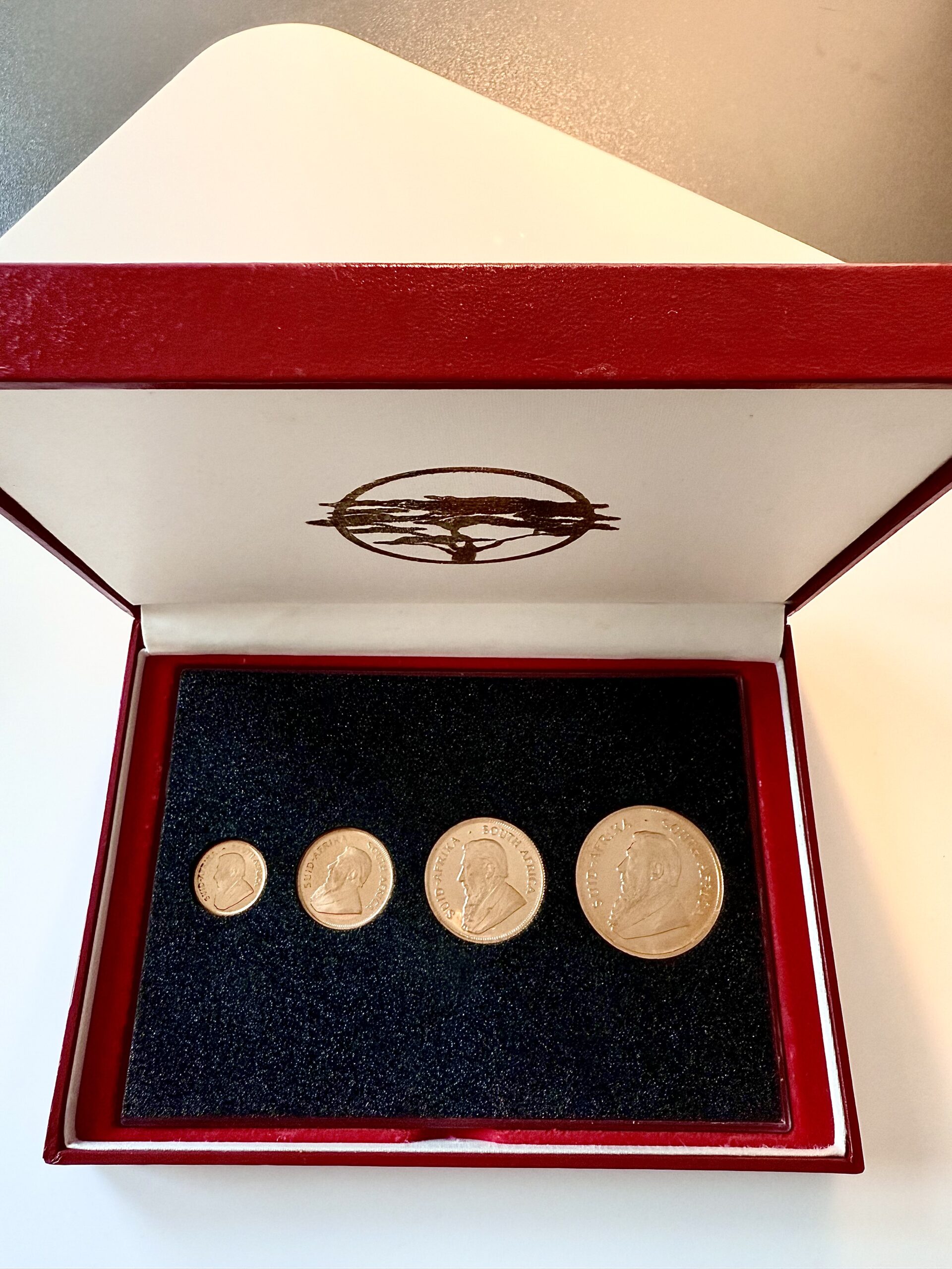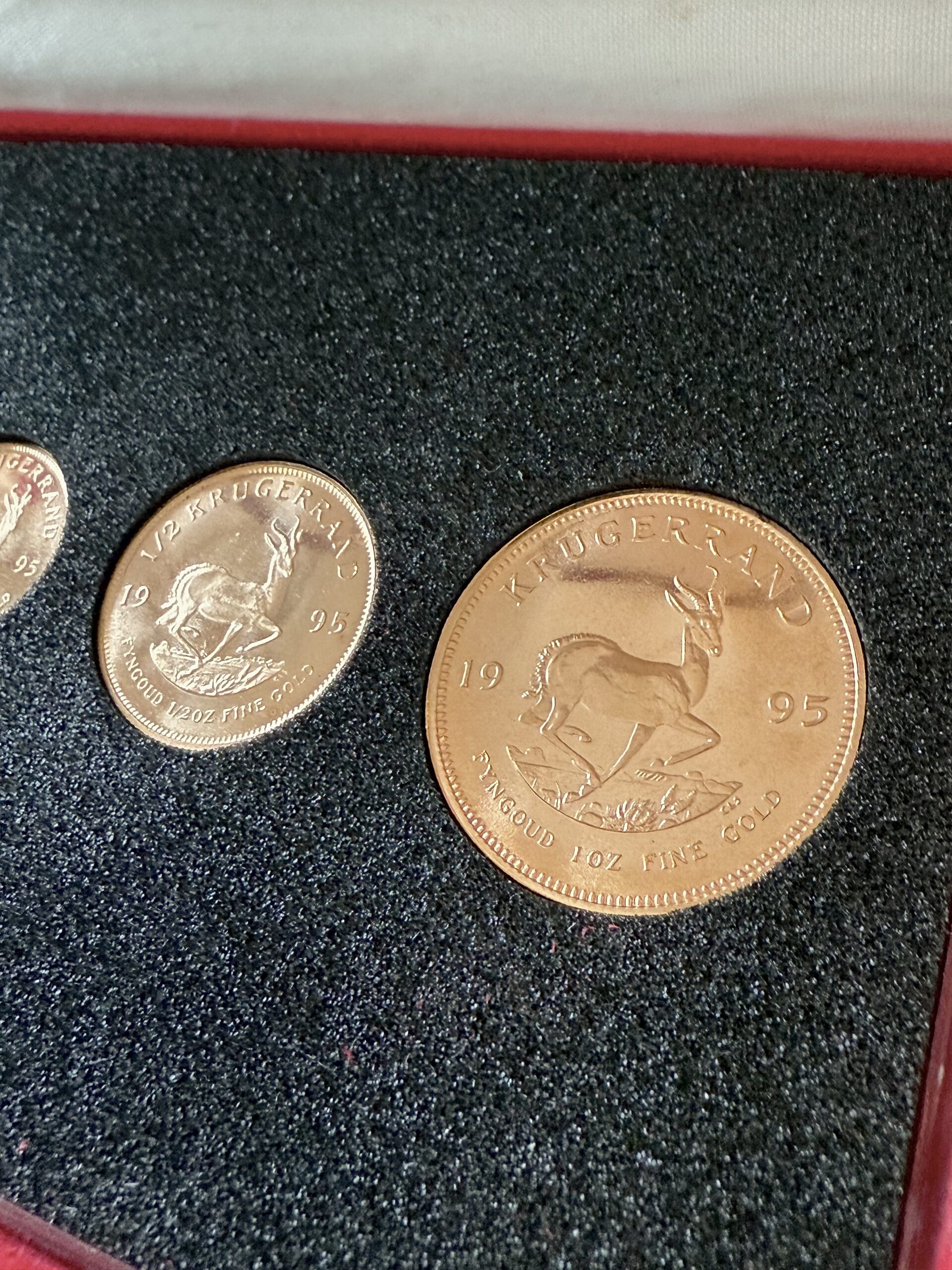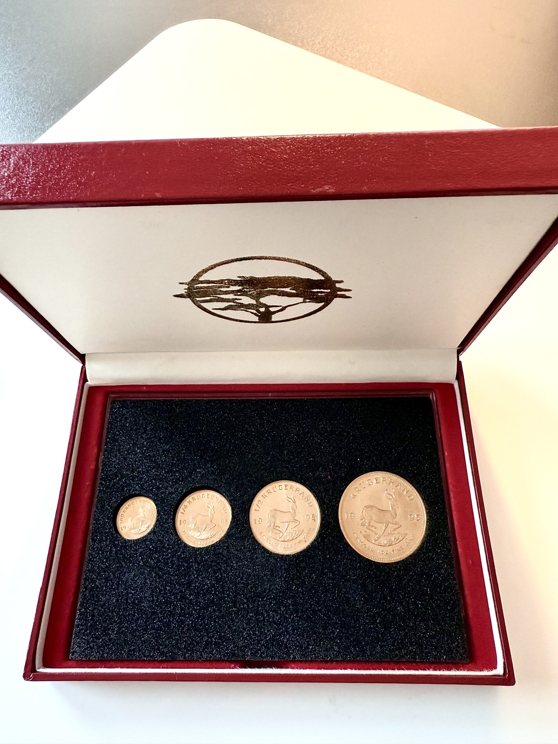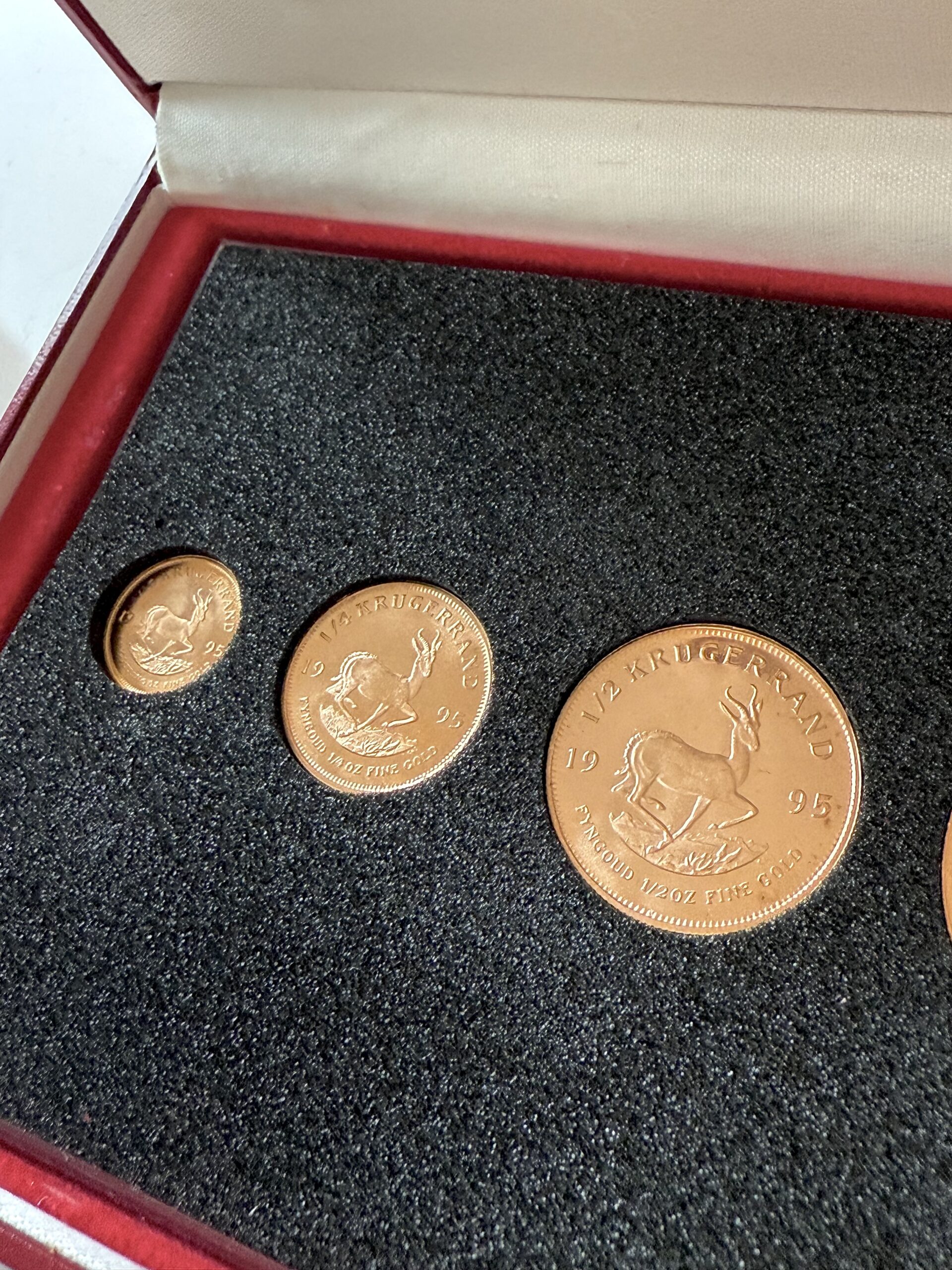 This is a 1.85 oz Krugerrand 4 gold coin set from 1995 in a red case.