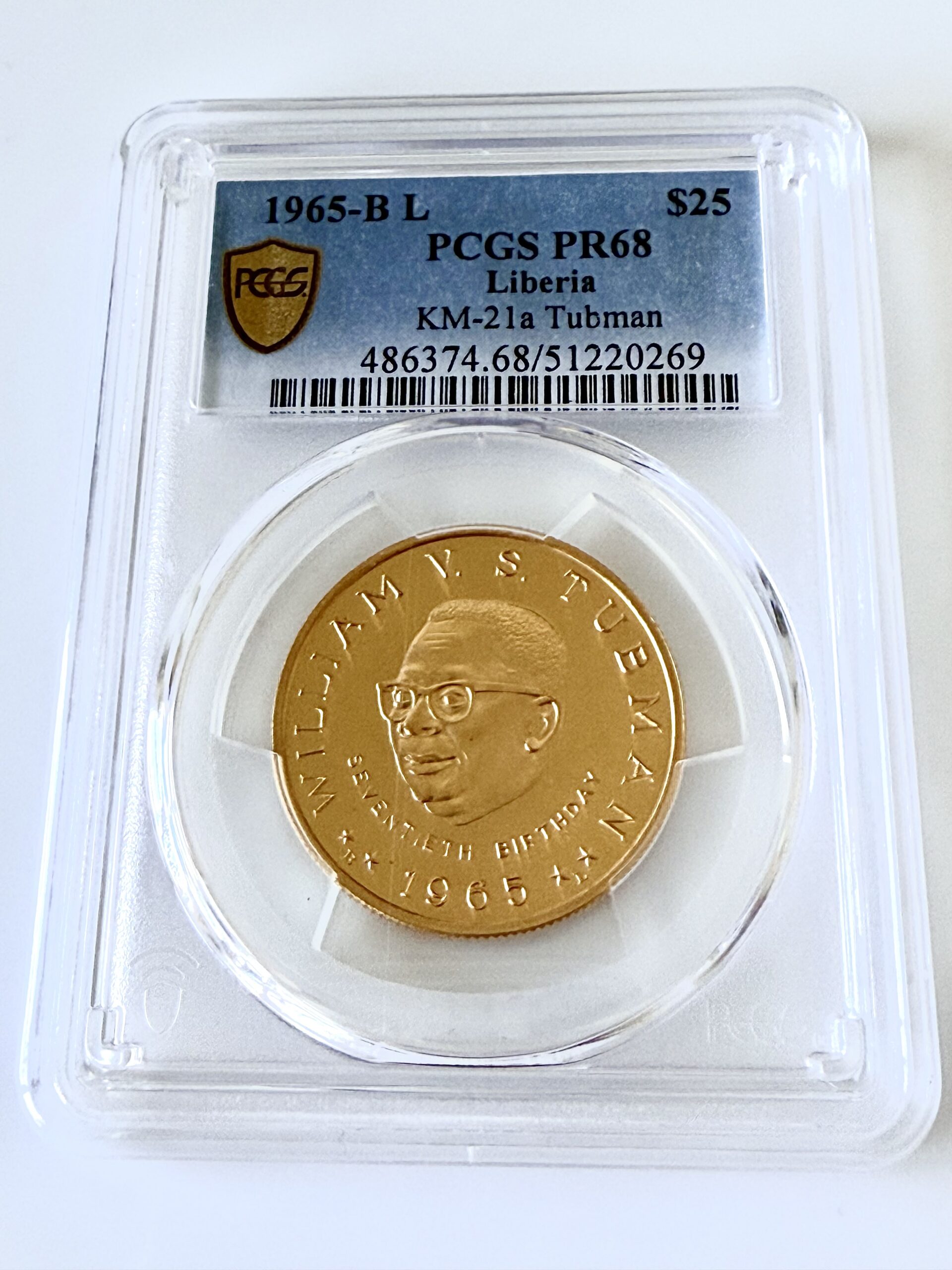 Liberia – Moneda de oro de 25 dólares – BL de 1965 – Tubman – 70.º aniversario – PCGS PR68