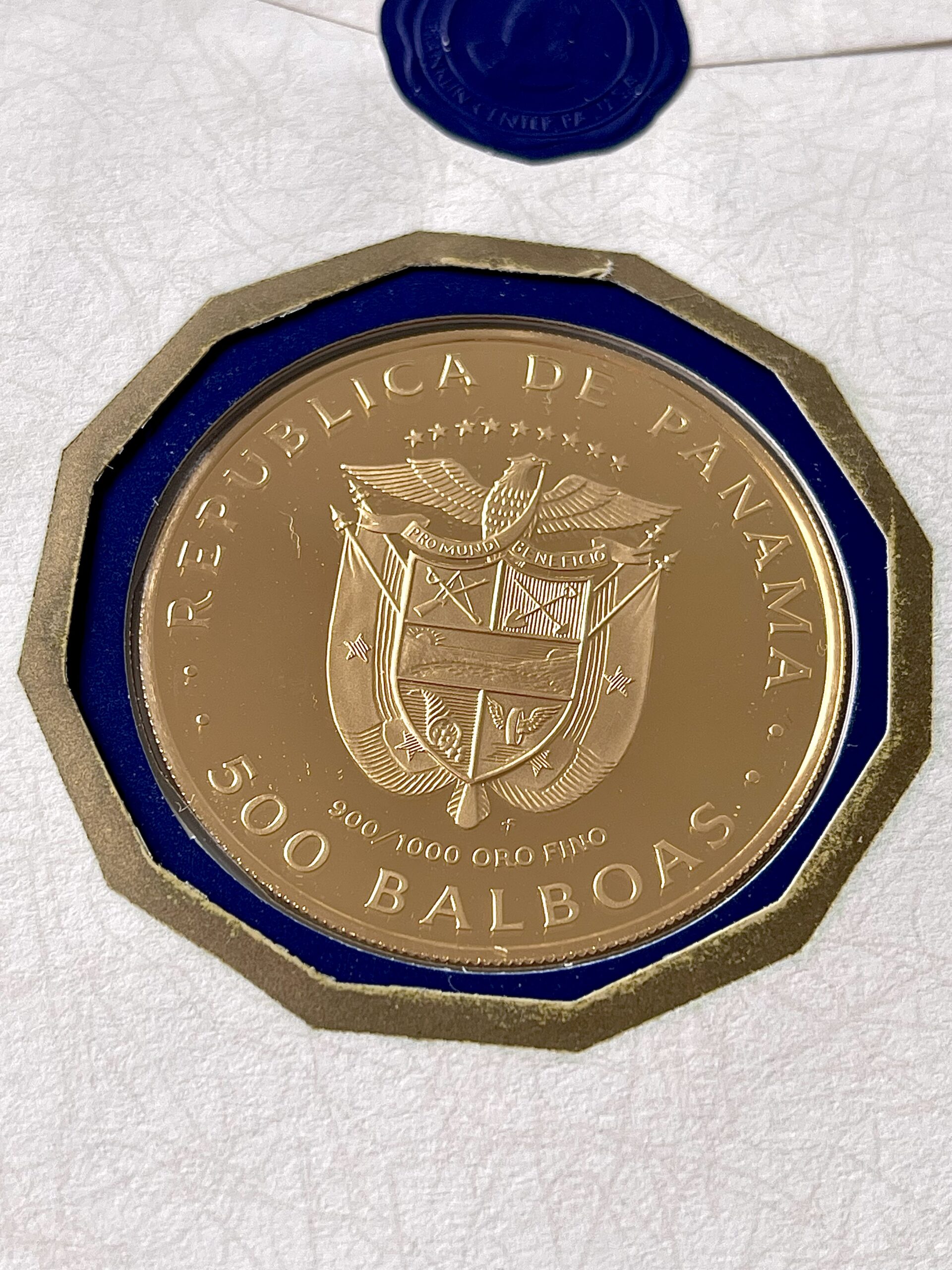 El anverso de la moneda representa el Escudo de Armas de la República de Panamá, así como las palabras «REPUBLICA DE PANAMA», «PRO MUNDI BENEFICIO» y «FM» para Franklin Mint. Las letras también indican la finura y el peso del oro, así como su valor de 500 balboas.