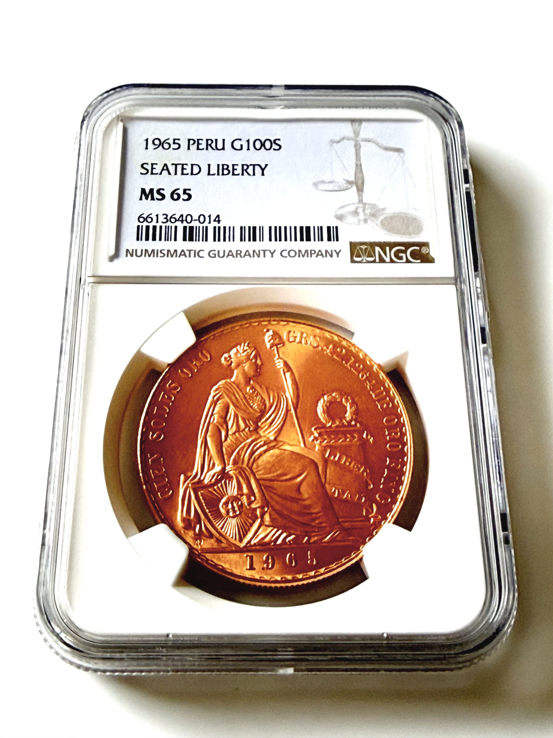 Perú – 1965 – 100 Soles – Libertad Sentada – Oro – NGC MS65 – Certificado 6613640-014