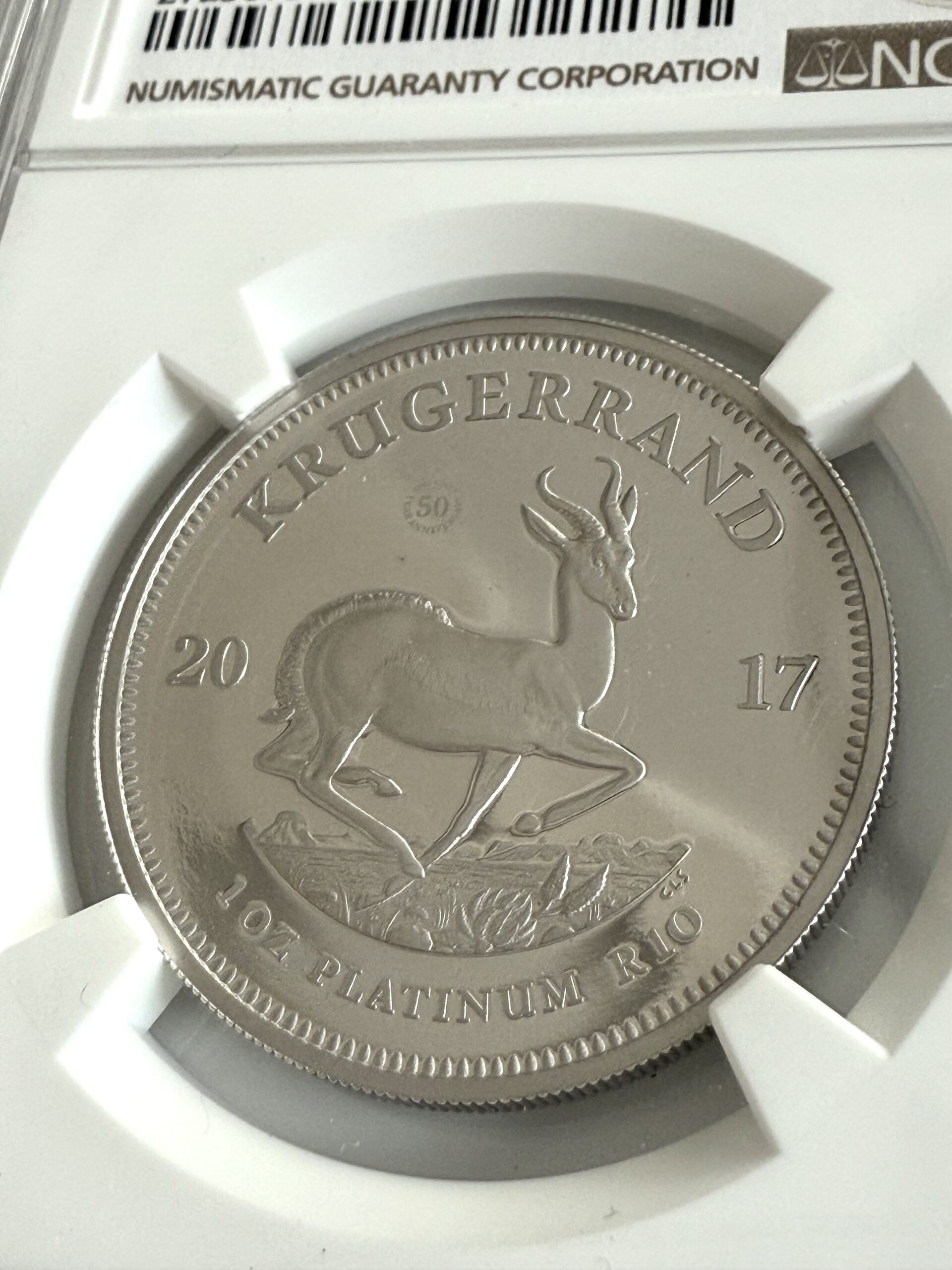 Para conmemorar el 50.º aniversario de la serie Krugerrand, la Casa de la Moneda de Sudáfrica lanzó su primera edición oficial de platino en 2017 , un hito numismático. Este Krugerrand de 1 oz en platino (0,999) fue acuñado en excelente calidad proof y certificado por la NGC con la máxima calificación PF70 Ultra Cameo (UCAM) , la máxima calificación posible por su impecable estado, contraste y calidad de acuñación.