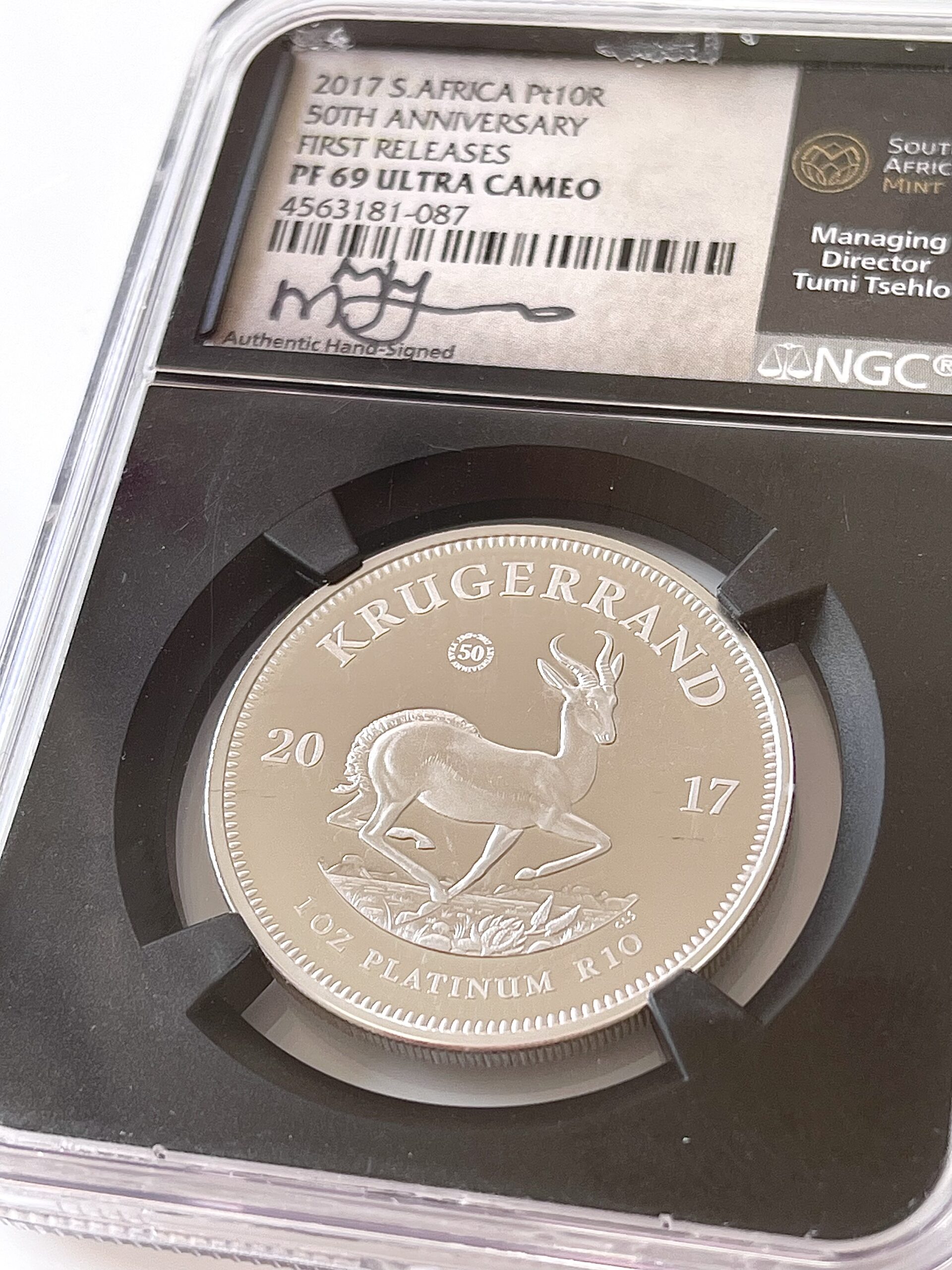 Sudáfrica – Krugerrand – 1 oz Platinum Proof – 2017 – Primeros lanzamientos Etiqueta Tumi Tsehlo – NGC PF69 UCAM