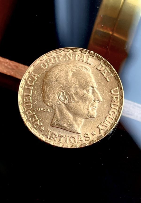 Esta es la moneda de oro de 5 pesos de Uruguay de 1930.