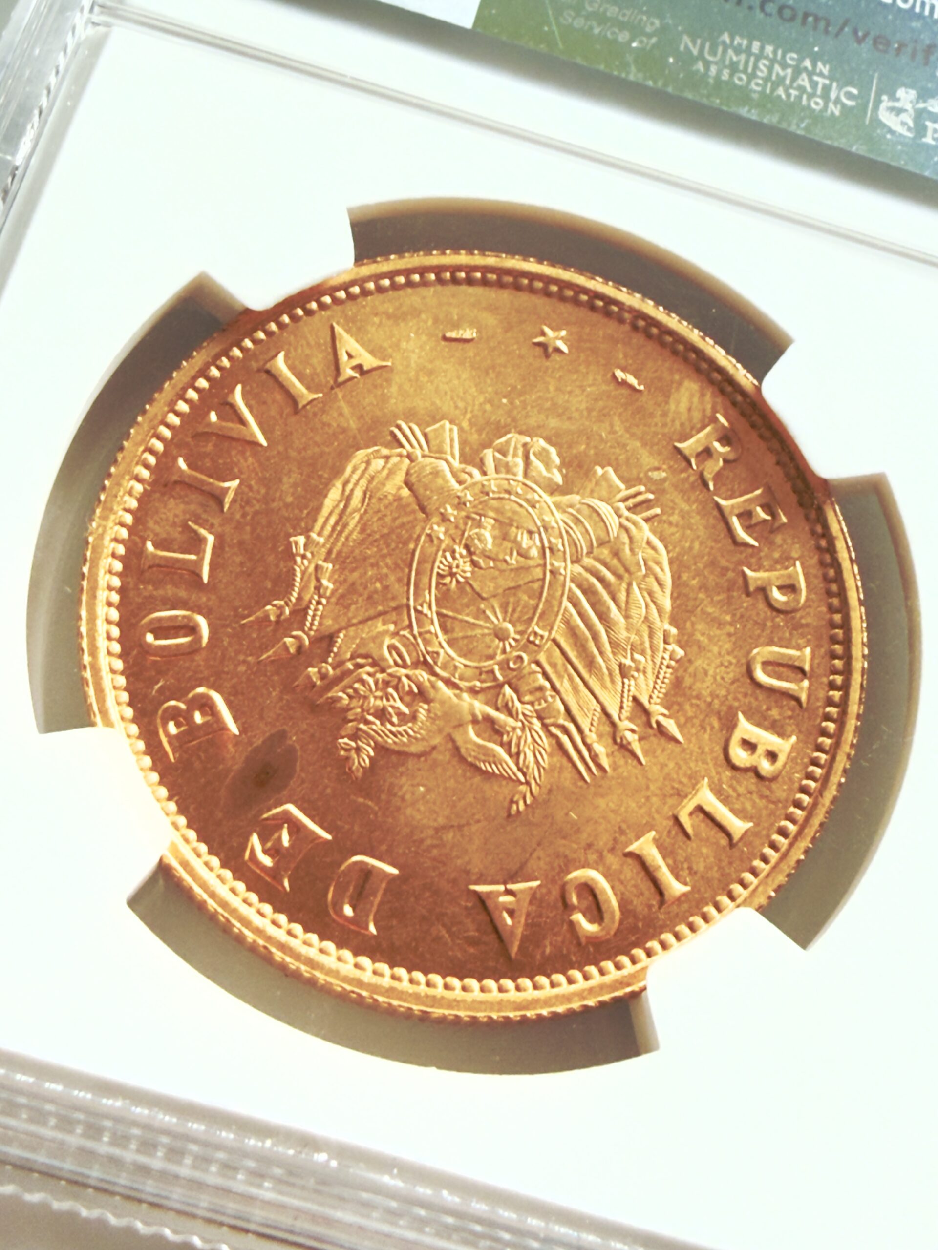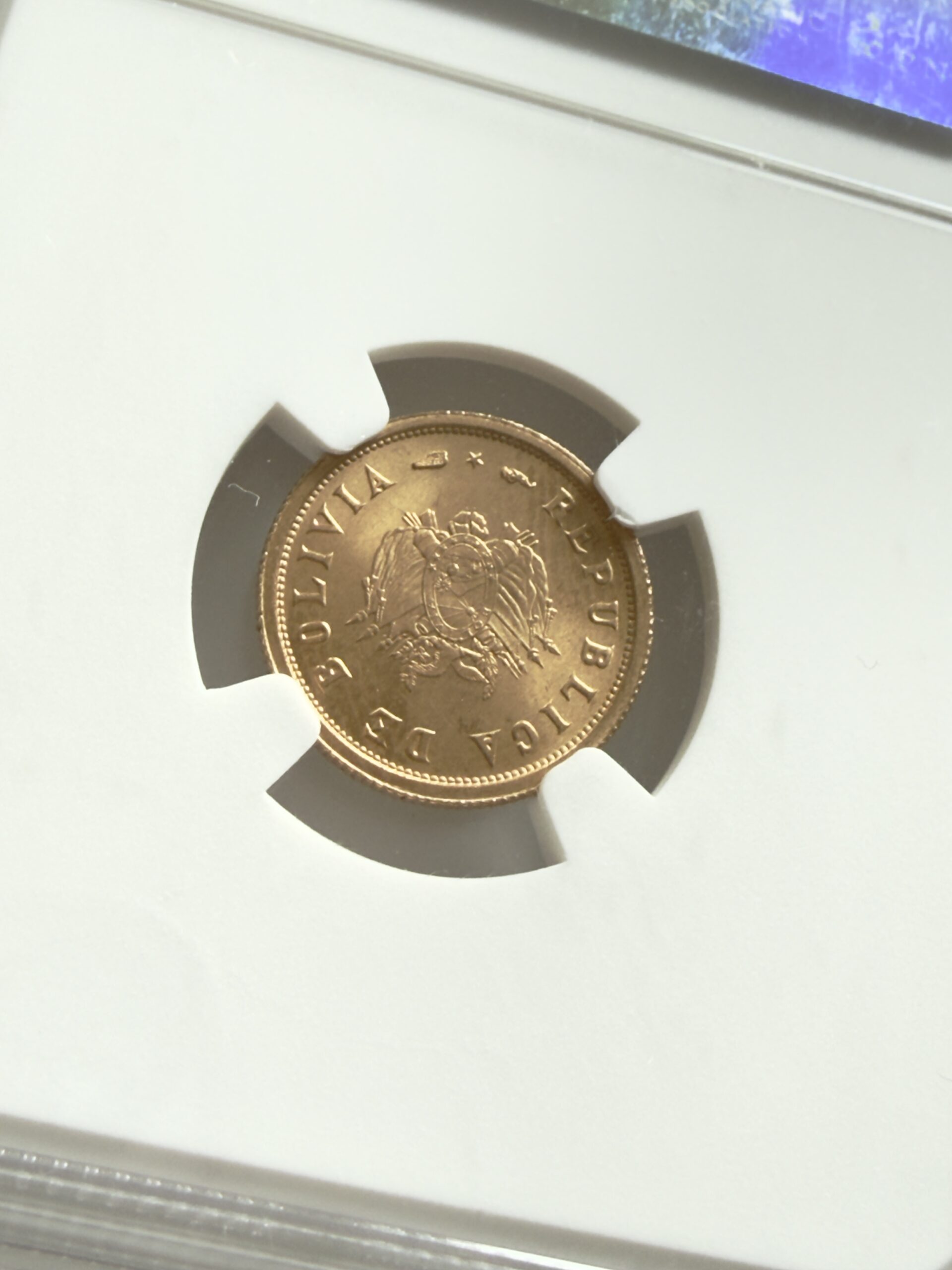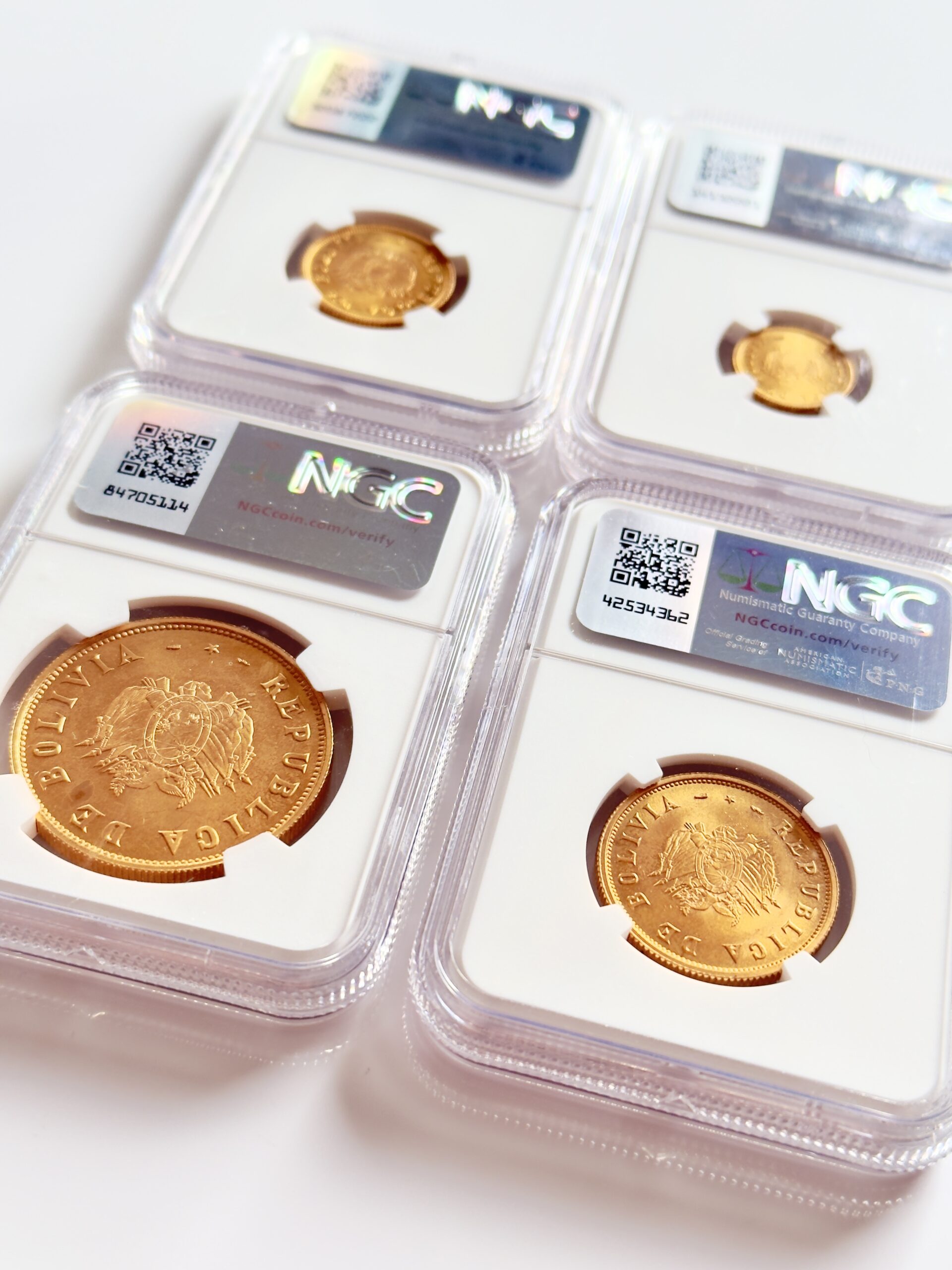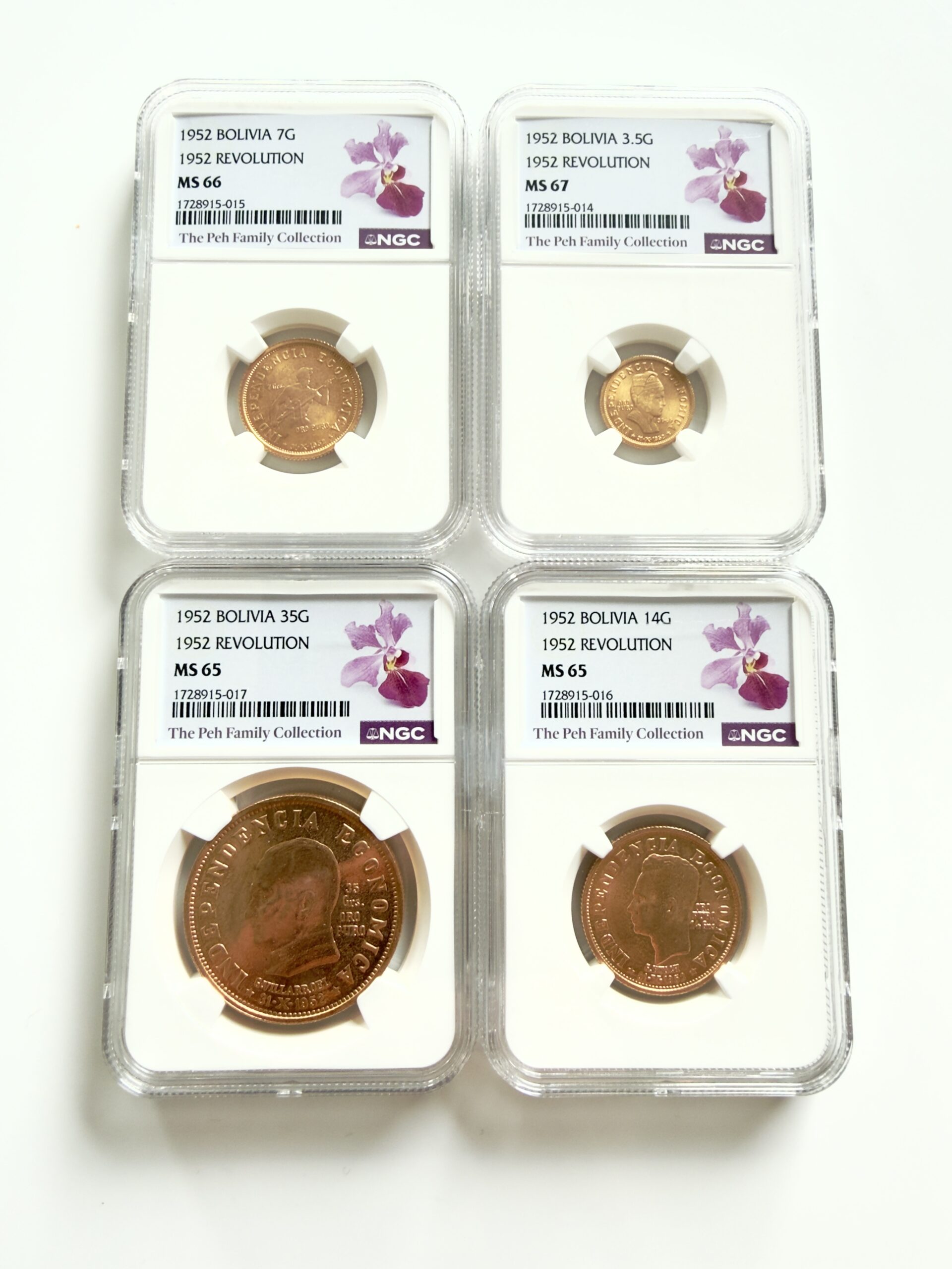 Bolivie – 1952 – Révolution – 35 14 7 3,5 grammes – Coffret de 4 pièces d’or – NGC MS65 MS67 – Poids brut 1,9135 oz