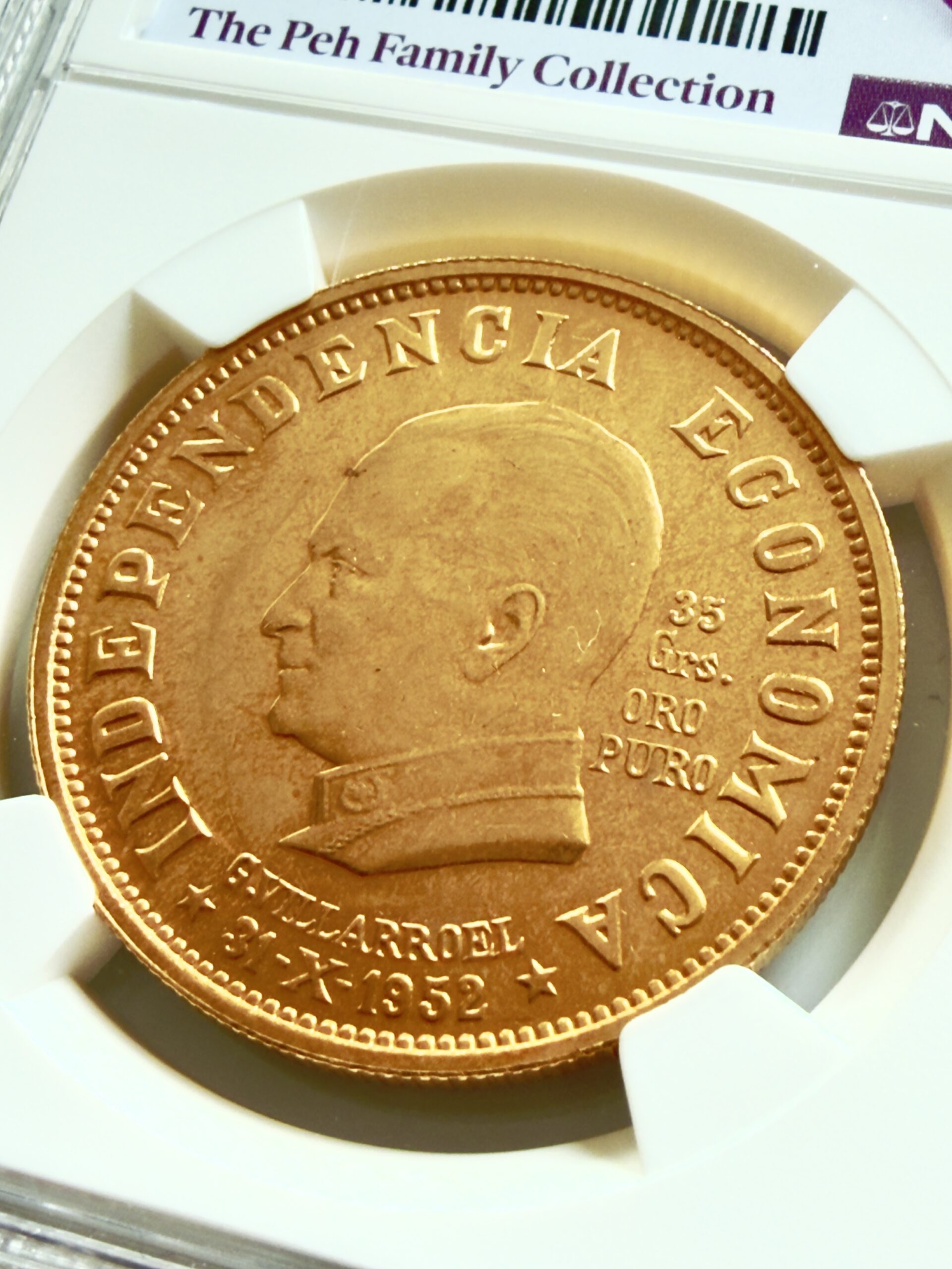 Revers avec portrait de G. Villarroel tourné vers la gauche et le principe directeur INDEPENDENCIA ECONOMICA , également 35 Grs. et ORO PURO . Cela montre immédiatement que la spécification Gramos est au cœur de la conception.