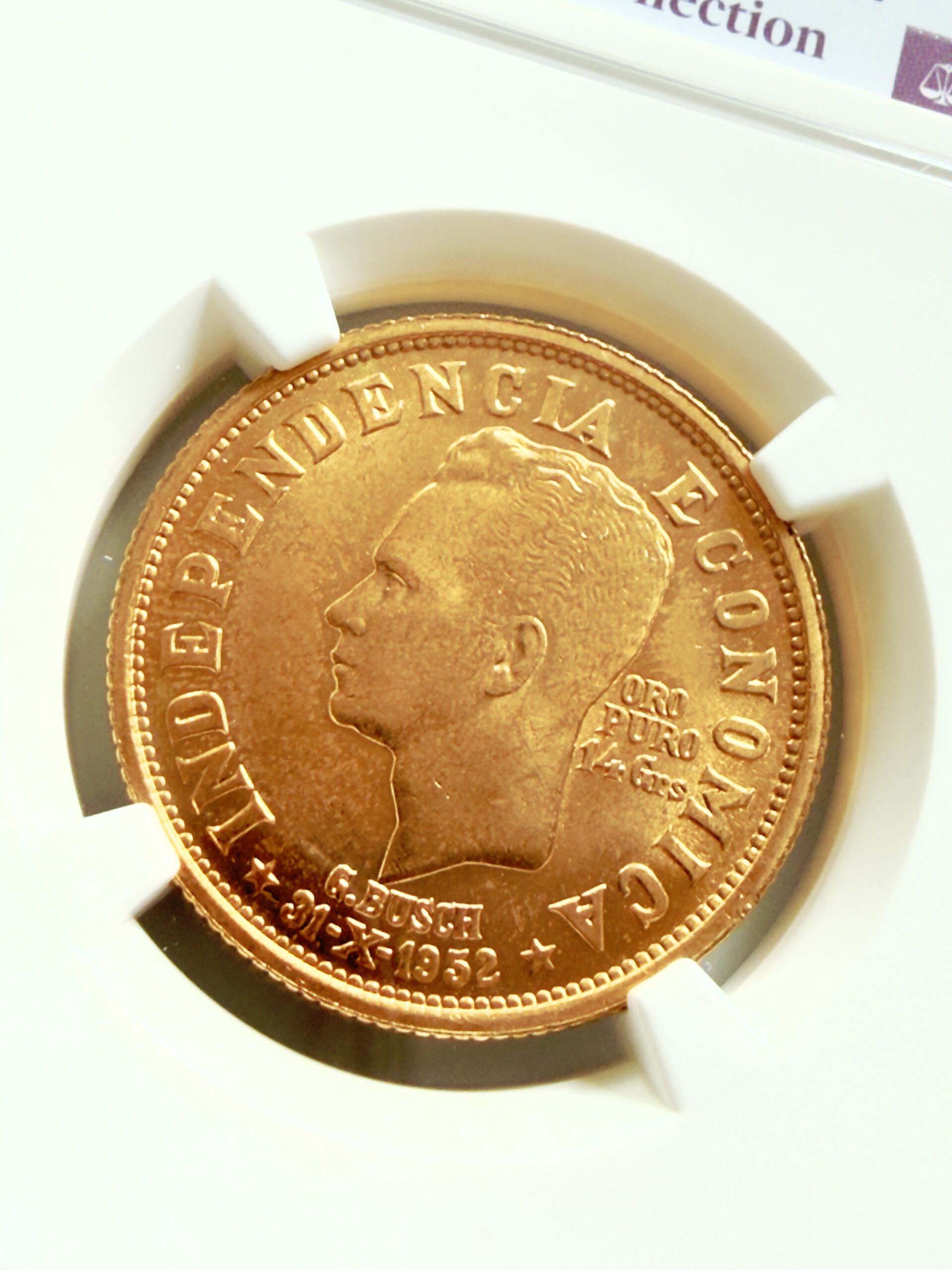 Revers avec la tête de G. Busch tournée vers la gauche, ainsi que INDEPENDENCIA ECONOMICA , ORO PURO et 14 Grs.