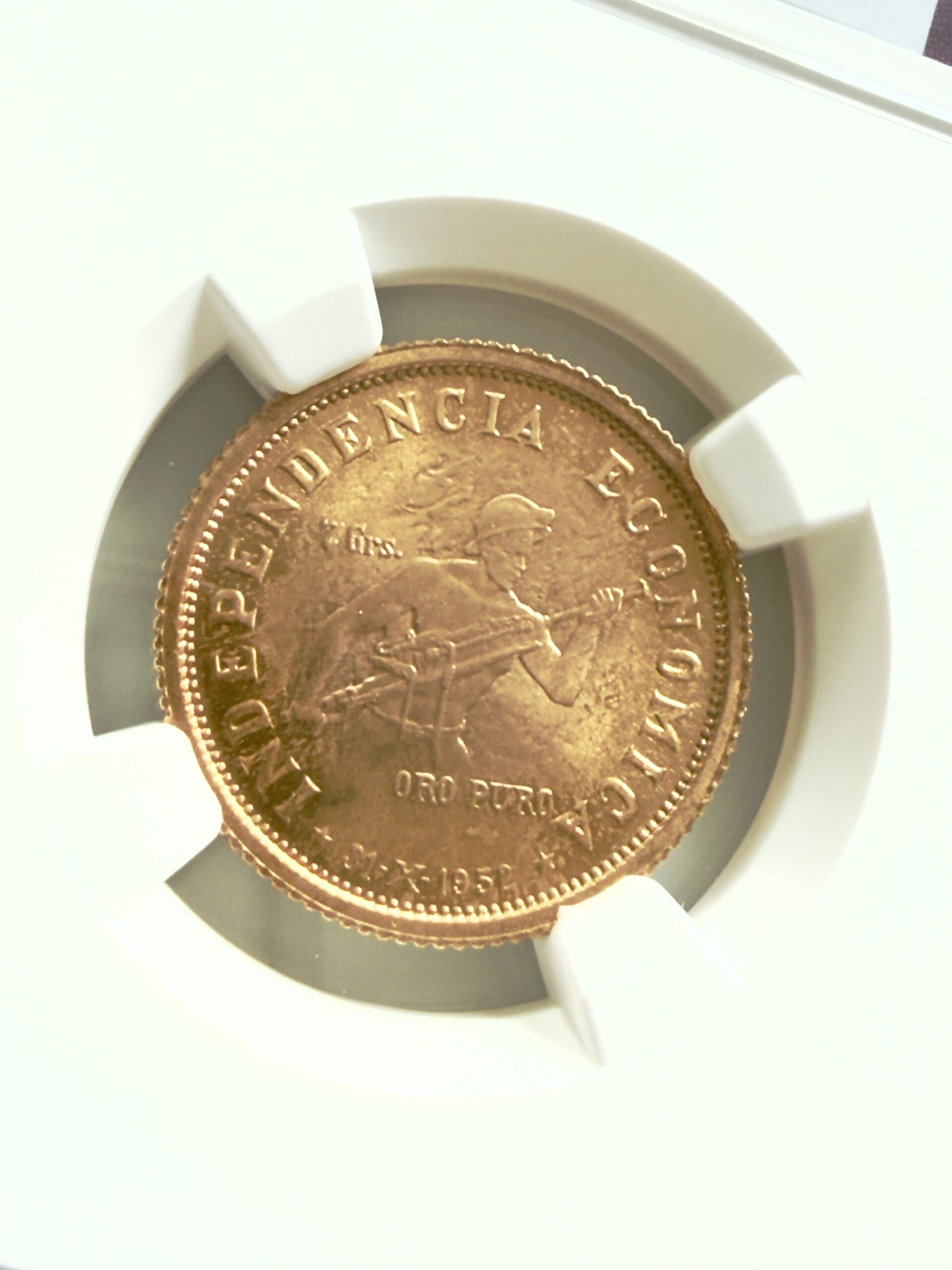 Au revers, la tête coiffée d’un chapeau est tournée vers la droite, avec INDEPENDENCIA ECONOMICA , ORO PURO et la ligne 3 Grs 5 comme indiqué sur la pièce.