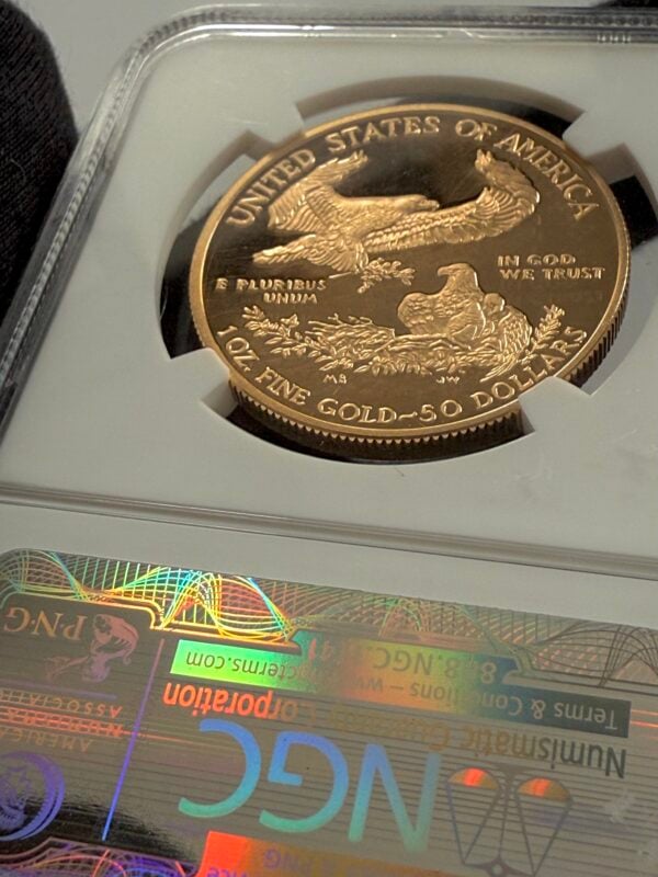 Il s’agit de la pièce d’or American Eagle de 50 dollars américains de 2012 en provenance des États-Unis. Il s’agit d’une édition spéciale certifiée par le NGC avec la plus haute qualité PF70 Ultra Cameo (UCAM). Cela en fait bien sûr un top pop (c’est-à-dire qu’il n’y a jamais eu d’édition mieux notée).