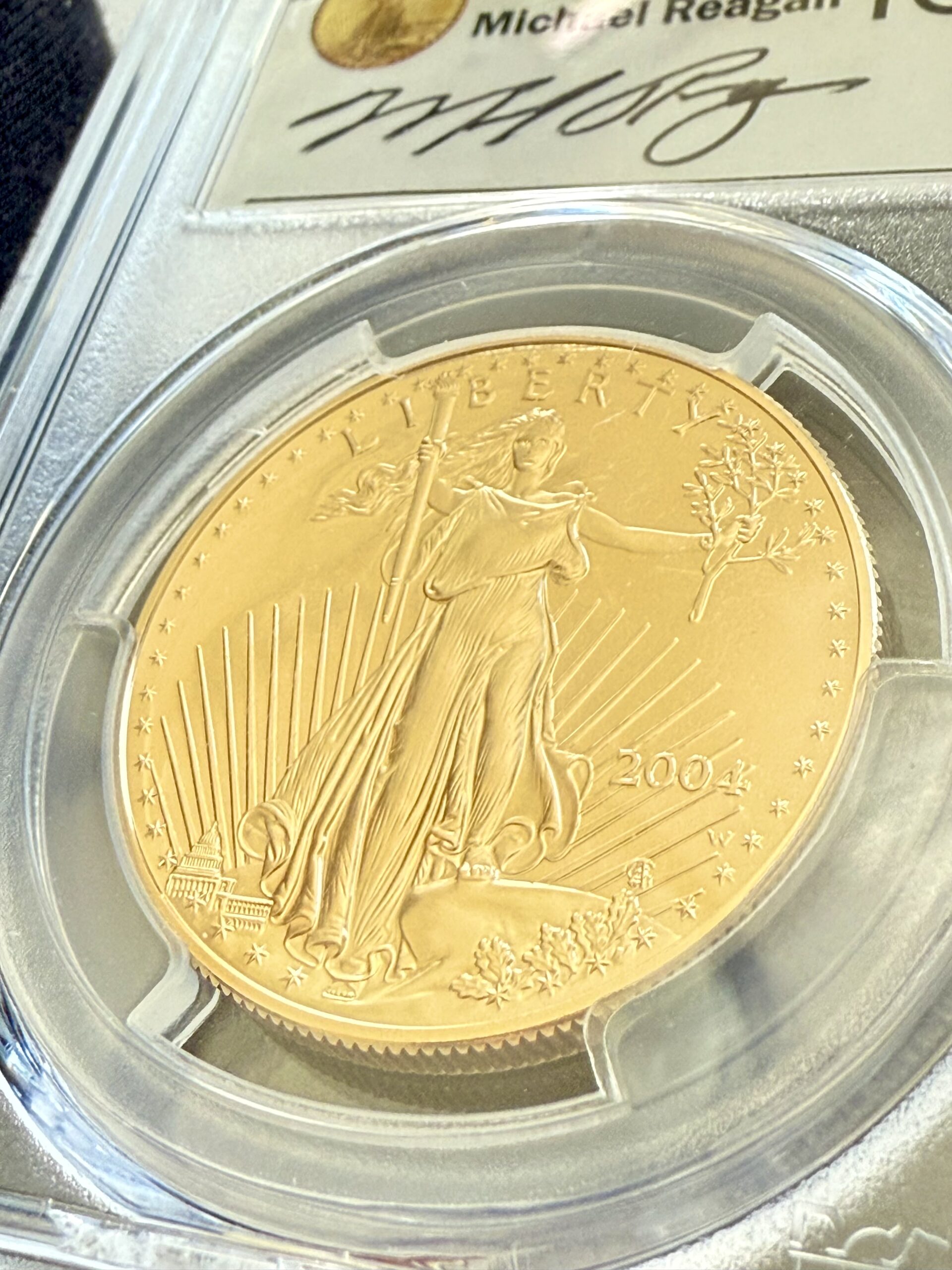 Cette pièce d’or American Eagle Proof de 2004 combine l’emblématique Liberty de Saint-Gaudens avec le revers classique de l’aigle de Miley Busiek et présente un contraste givré miroir très prononcé en PCGS PR69 DCAM . Cela donne aux reliefs un aspect particulièrement tridimensionnel et détaillé. L’une de ses particularités est l’ insert PCGS « Reagan Legacy Series » avec la signature originale de Michael Reagan , qui inscrit thématiquement cette pièce en l’honneur du président Ronald Reagan et en accentue encore davantage la valeur de collection.