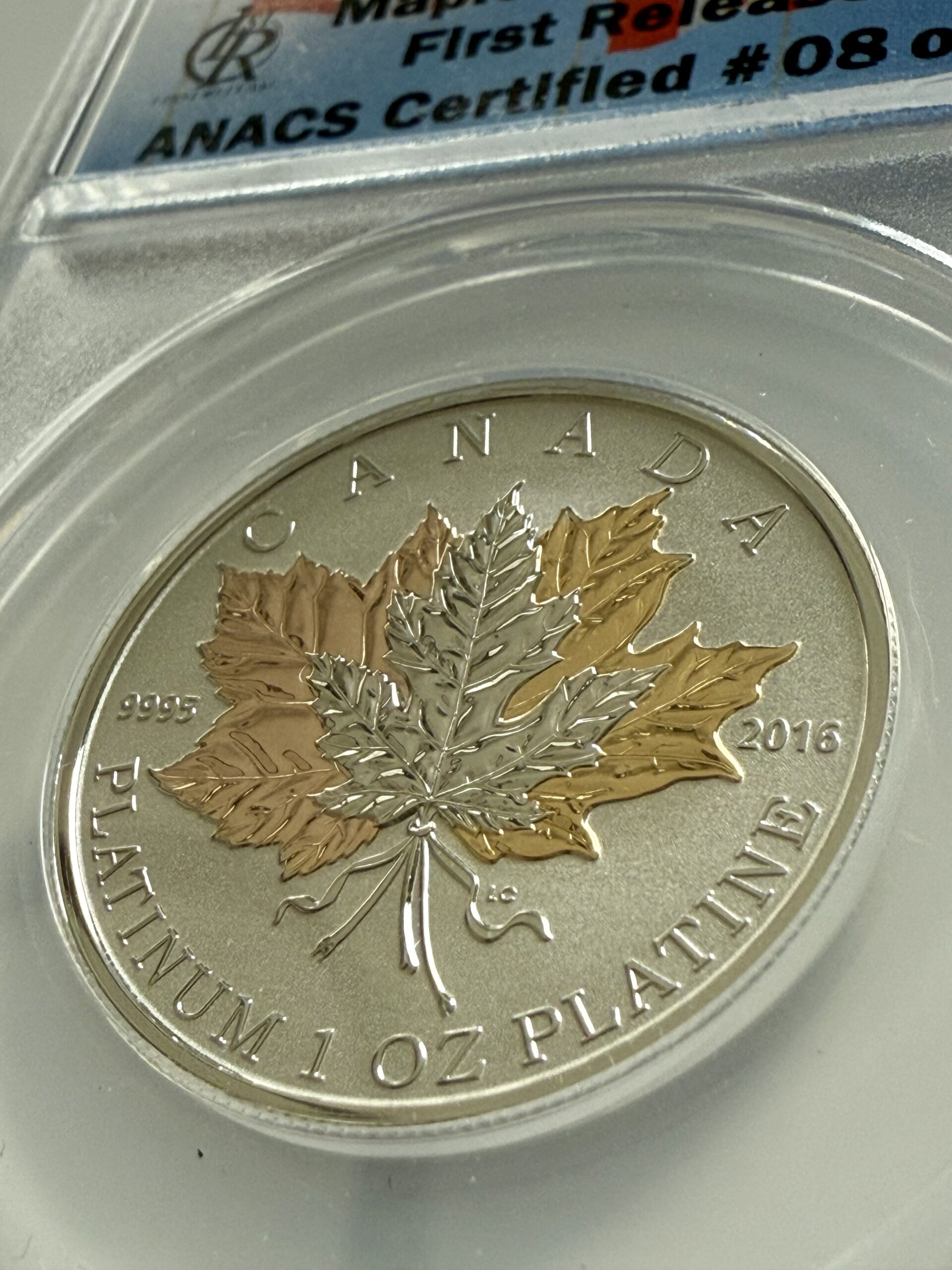 La moneta da 1 oz in platino “Maple Leaf Forever” presenta tre foglie d’acero, che rappresentano tre specie canadesi. Due foglie sono impreziosite da una doratura selettiva bicolore , mentre la foglia centrale rimane in platino. La finitura a prova di inversione crea campi opachi e rilievi brillantemente lucidati con una profondità significativa. Il nostro esemplare è certificato da ANACS in RP70 DCAM First Release (nota sull’etichetta: Certificato n. 08 di 29 nell’ambito della presentazione First Release) e si presenta in modo impeccabile nel suo supporto.