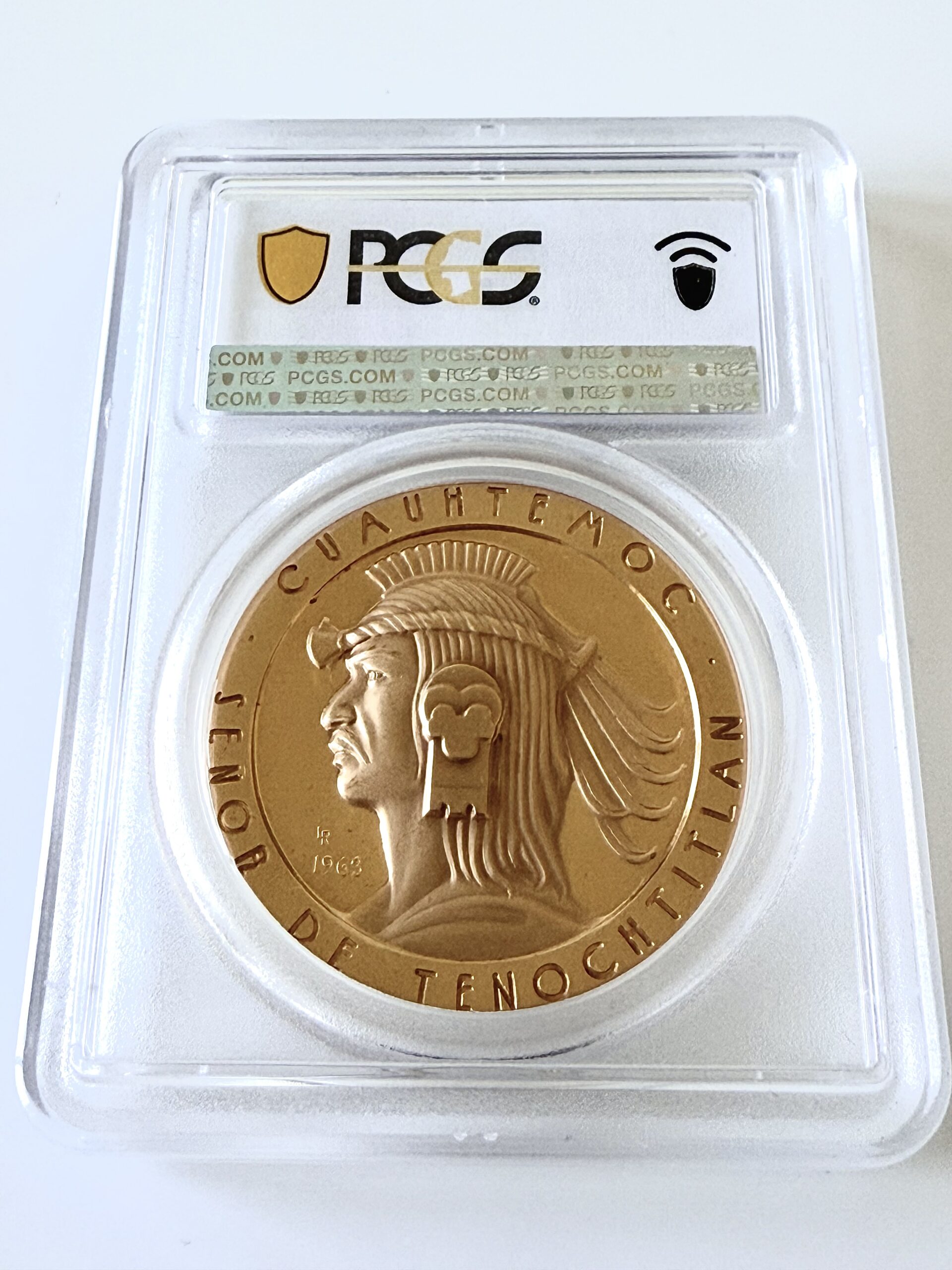 Questa medaglia d’oro è stata coniata nel 1963 per commemorare Hernan Cortes e Cuauhtemoc. Questa edizione è stata certificata SP63 da PCGS.