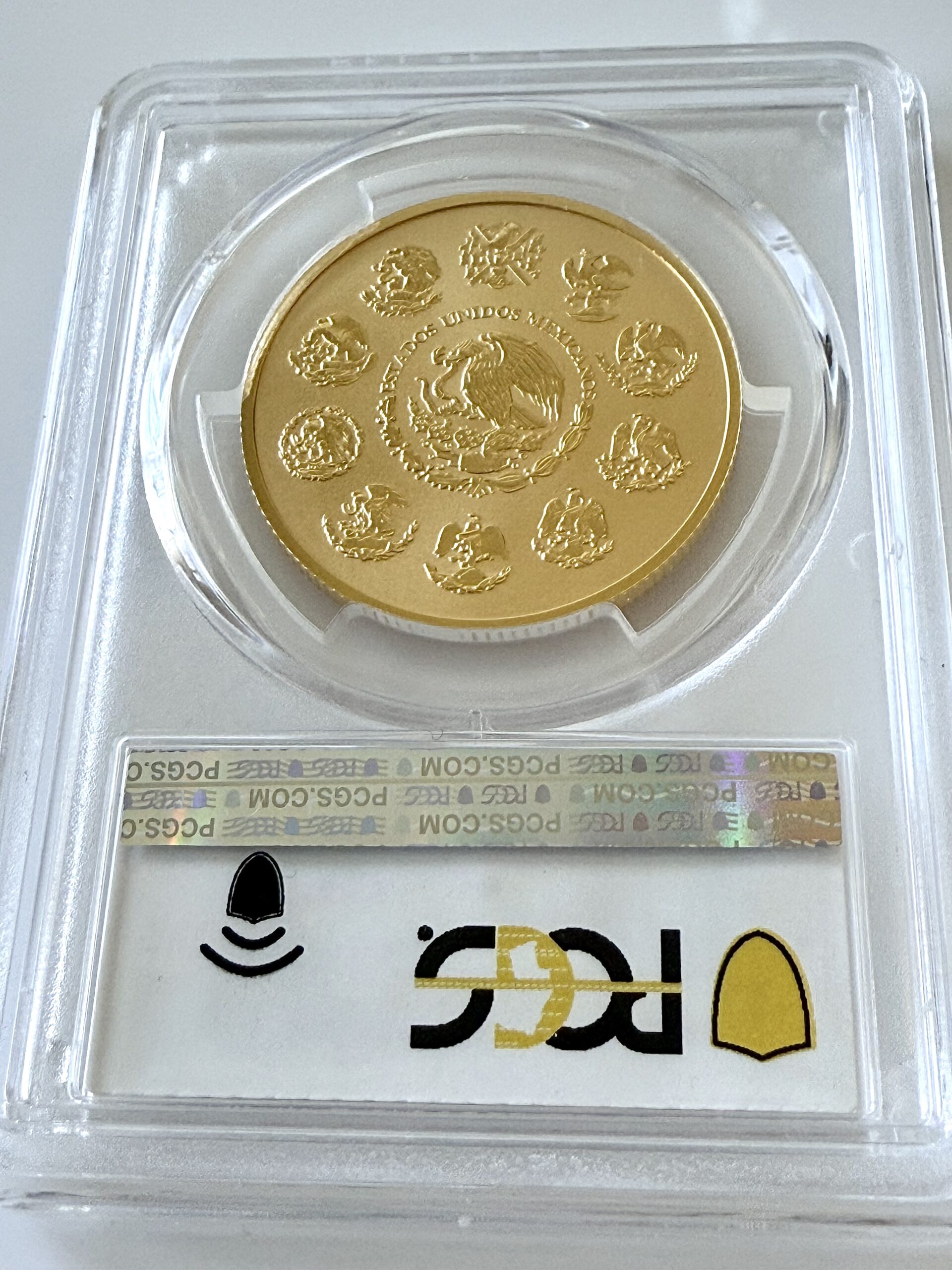 Sull’altro lato della moneta d’oro Libertad c’è lo stemma nazionale del Messico e il testo “Estados Unidos Mexicanos” (“Stati Uniti del Messico”), circondato da dieci forme storiche dello stemma.