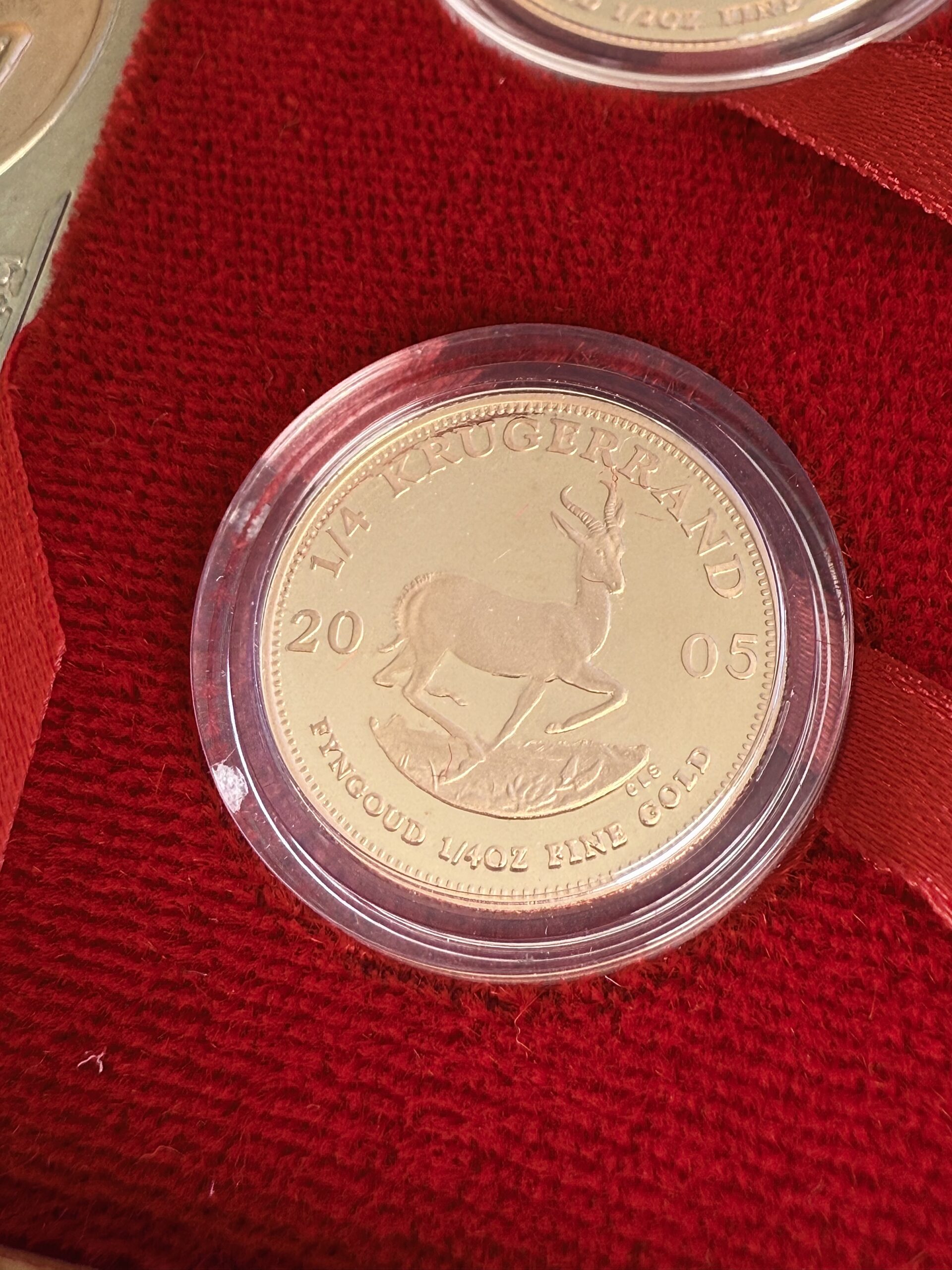 Questo esclusivo set Krugerrand Anniversary del 2005 è stato emesso dalla Zecca del Sudafrica per celebrare il 25° anniversario dei set Prestige. Combina raffinatezza numismatica, importanza storica e la massima qualità di conio in un set eccezionale. Il set contiene quattro monete d’oro Krugerrand di qualità proof , per un peso totale di 1,85 once di oro fino .