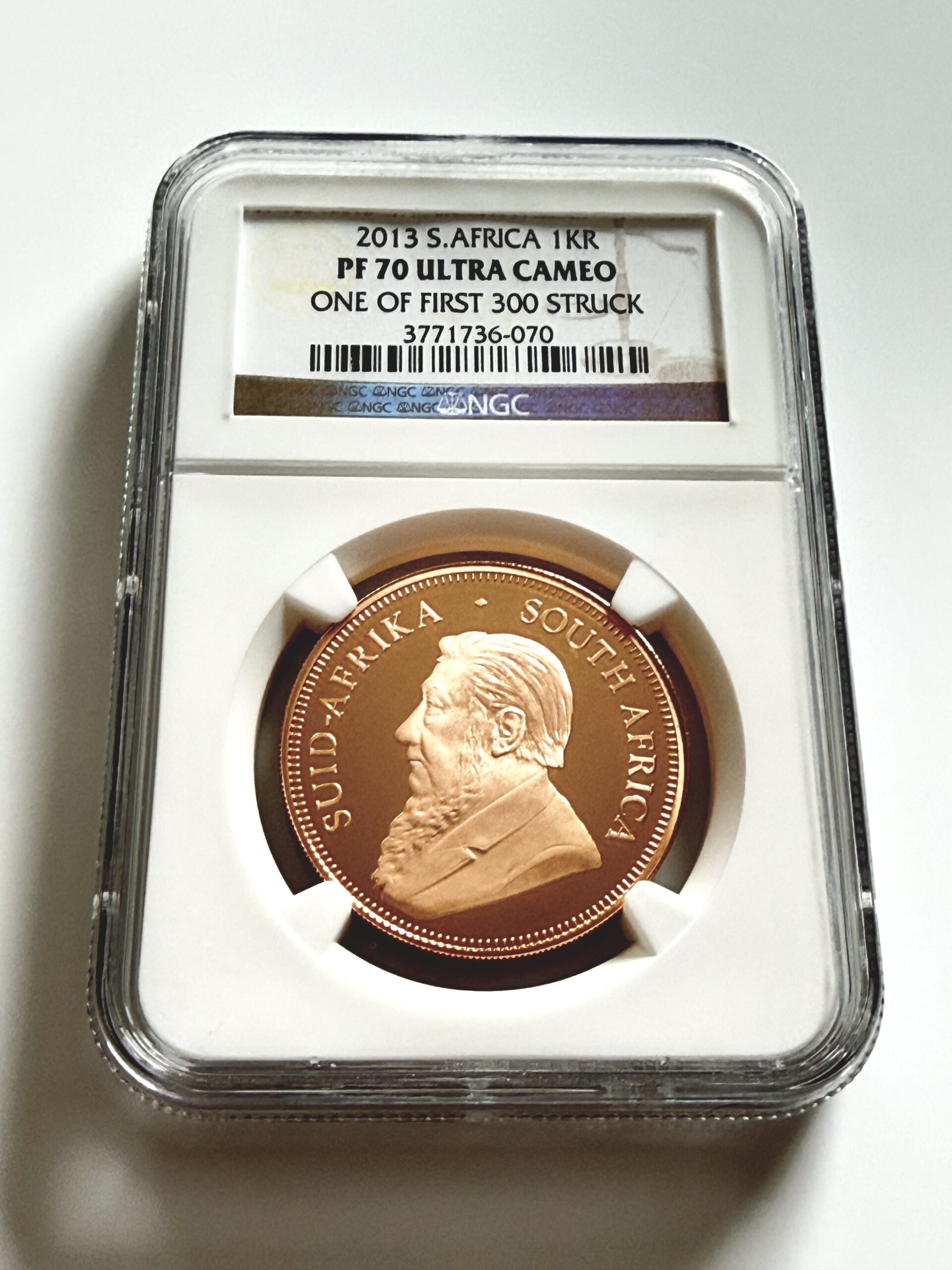 Questa moneta d’oro Krugerrand da 1 oz del 2013 proviene dall’edizione Proof di alta qualità della Zecca del Sud Africa ed è stata certificata da NGC con il grado più alto PF70 Ultra Cameo . Ciò significa che la moneta è in perfette condizioni, senza segni visibili di conio o manipolazione, motivo per cui questo grado è estremamente raro nel mercato dei collezionisti.