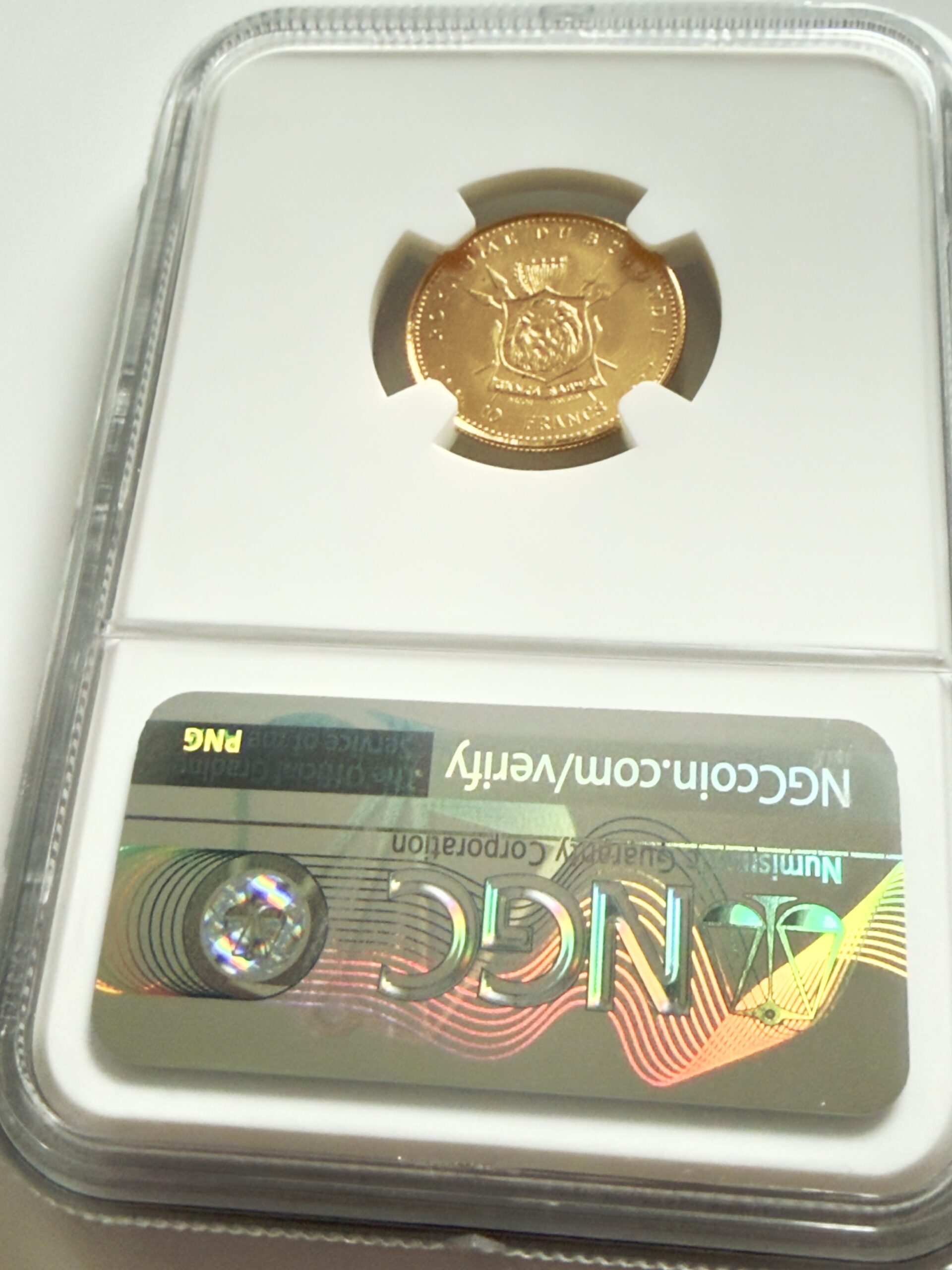 На оборотной стороне изображен герб , а под ним номинал 10 франков . Таким образом, монета сочетает в себе представительную государственную символику с лаконичным золотым дизайном, который особенно ценится в хорошем состоянии.