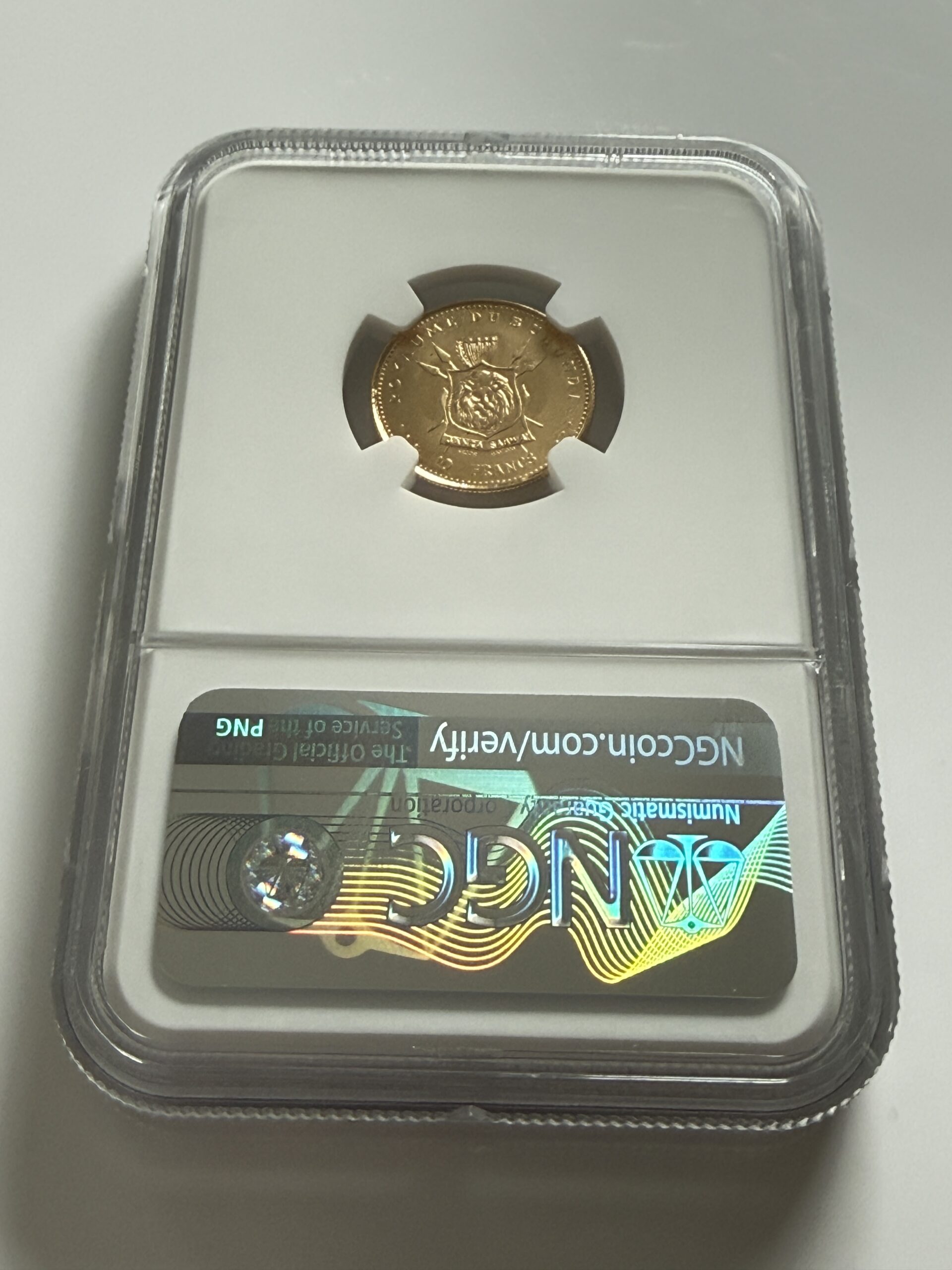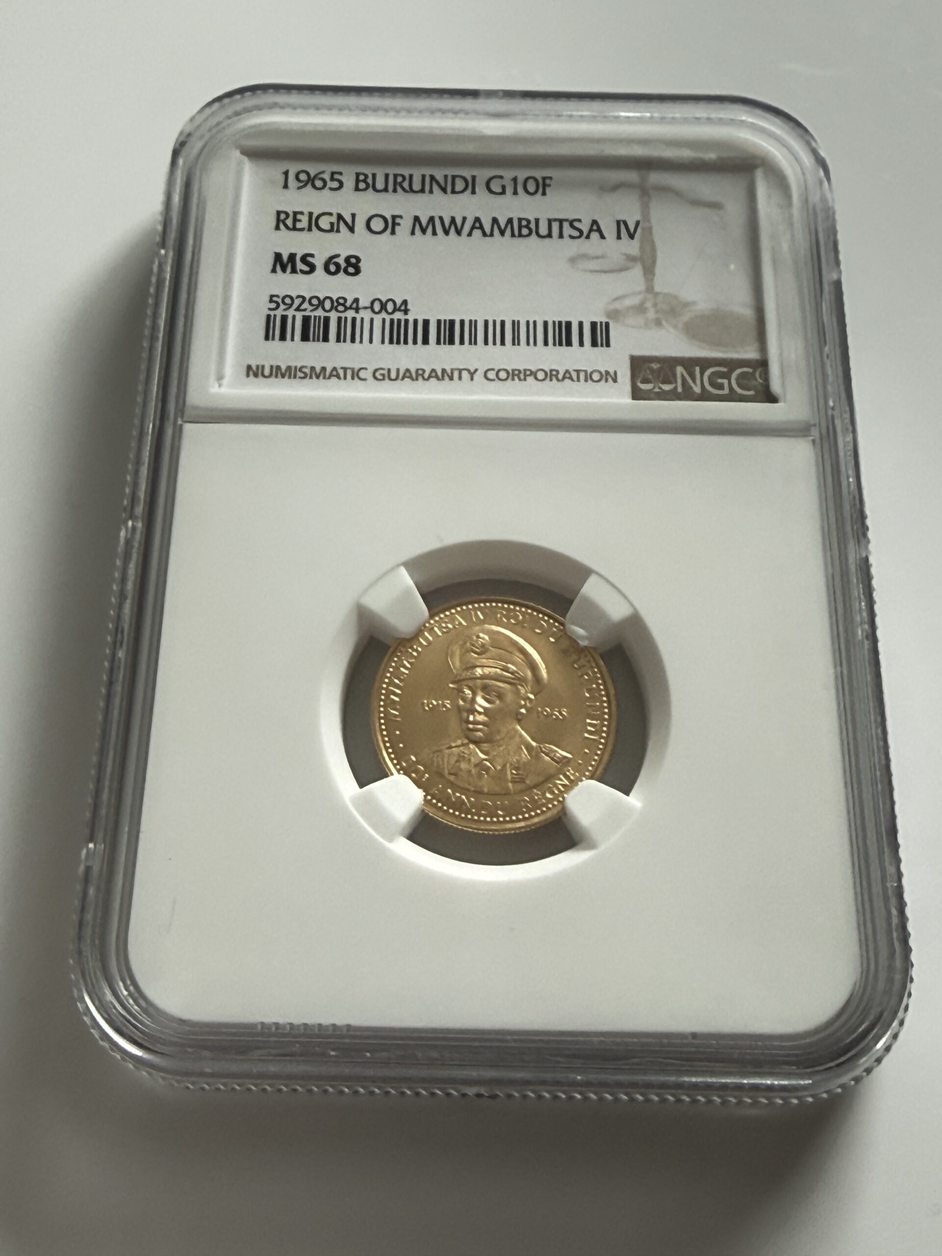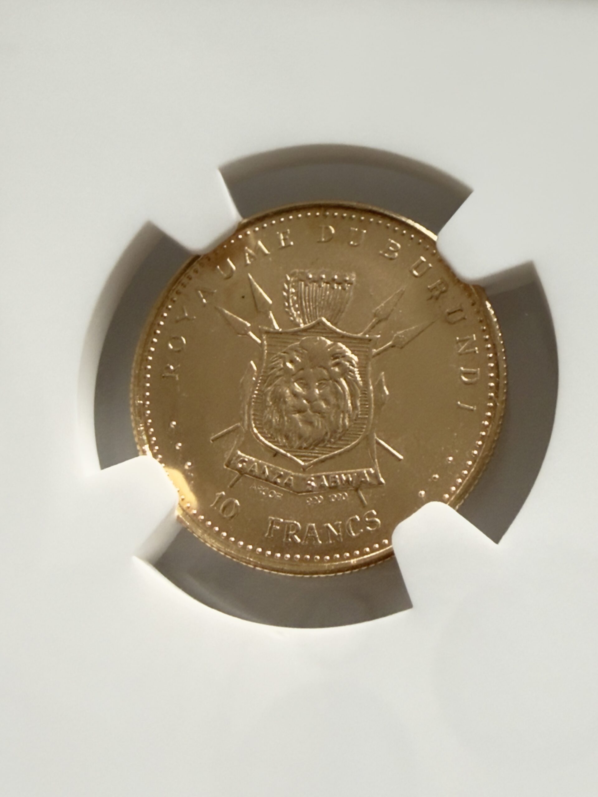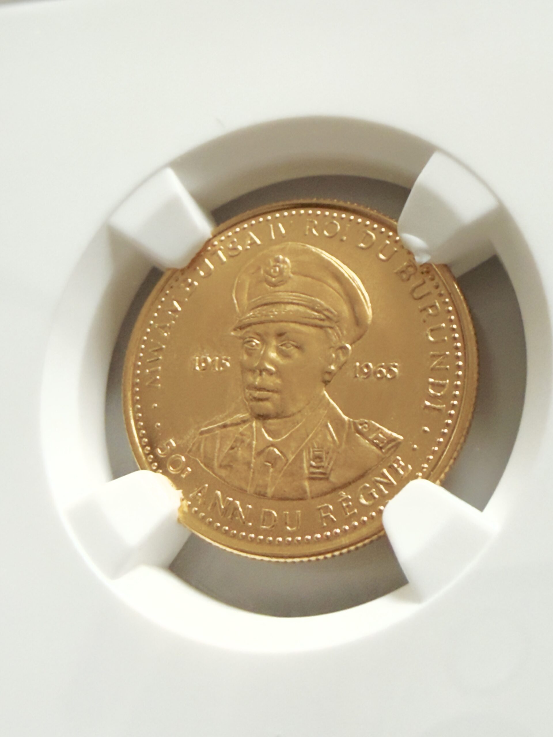 Бурунди — 1965 — 10 франков — 50 лет правления Мвамбутсы IV — Золото — NGC MS68