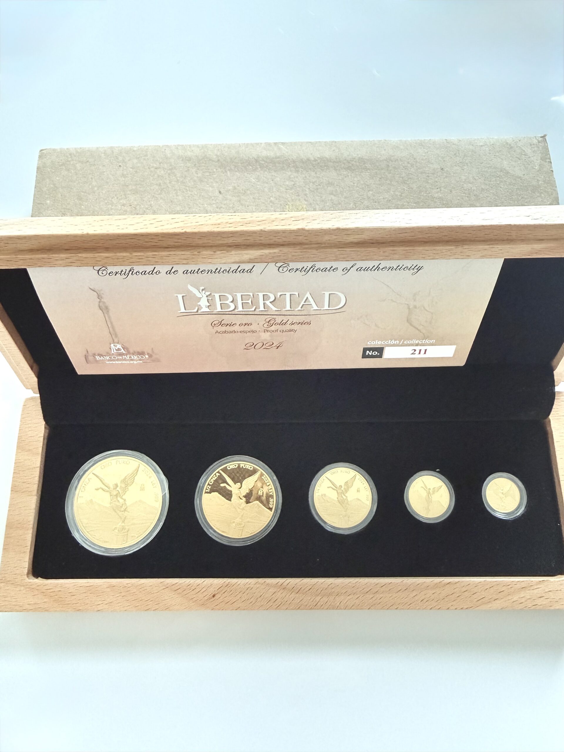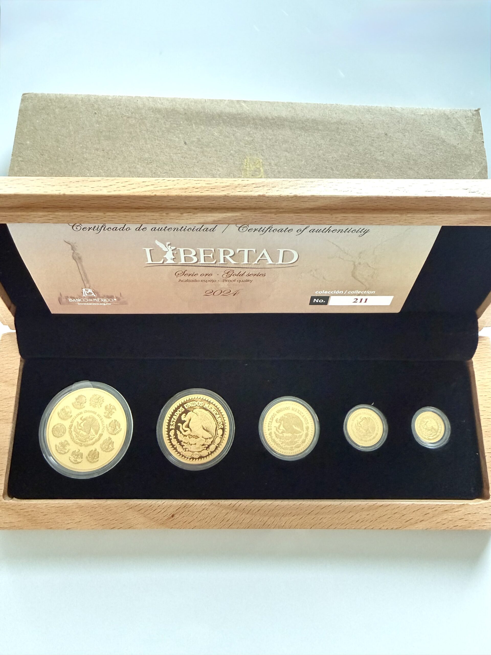 Этот золотой коллекционный набор Libertad из Мексики 2024 года сочетает в себе классические мотивы серии Libertad и представляет собой высококачественное коллекционное издание. В набор входят все пять пробных номиналов, выпущенные Банком Мексики и отчеканенные в Монетном дворе Мексики . Сочетание полной серии, элегантного оформления и точного исполнения делает это издание особенно привлекательным для взыскательных коллекционеров современных золотых монет.
