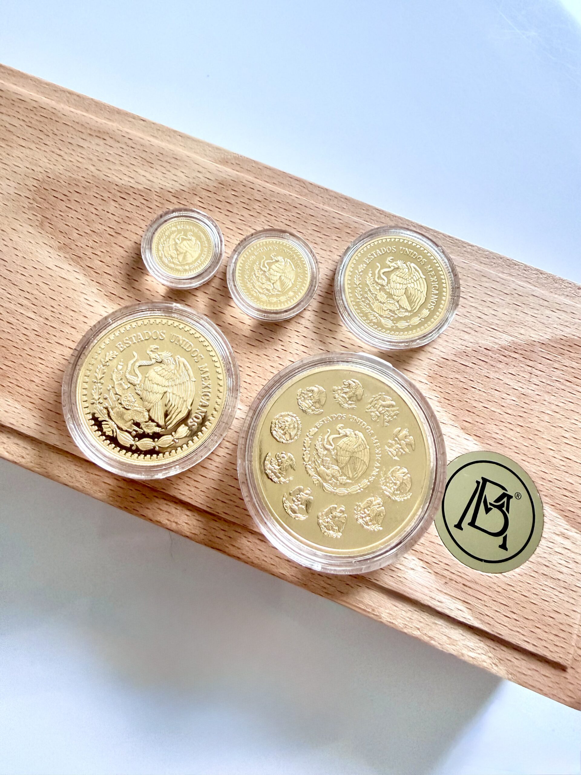 На пяти золотых монетах изображена крылатая богиня победы Либертад на фоне вулканического ландшафта Мексики на аверсе, а на реверсе — мексиканский герб с орлом и змеей. Монеты в версии Proof отличаются глубоко зеркальной полировкой и тонким матовым рельефом, что подчеркивает престижность этого набора.