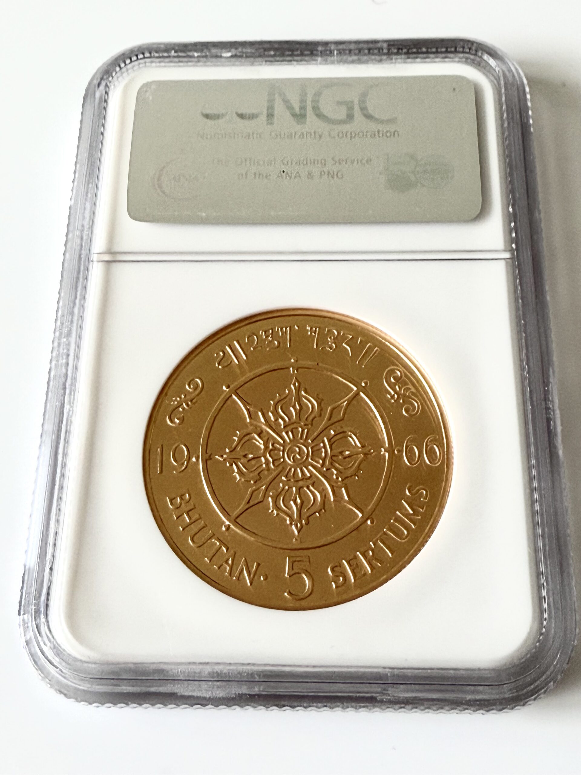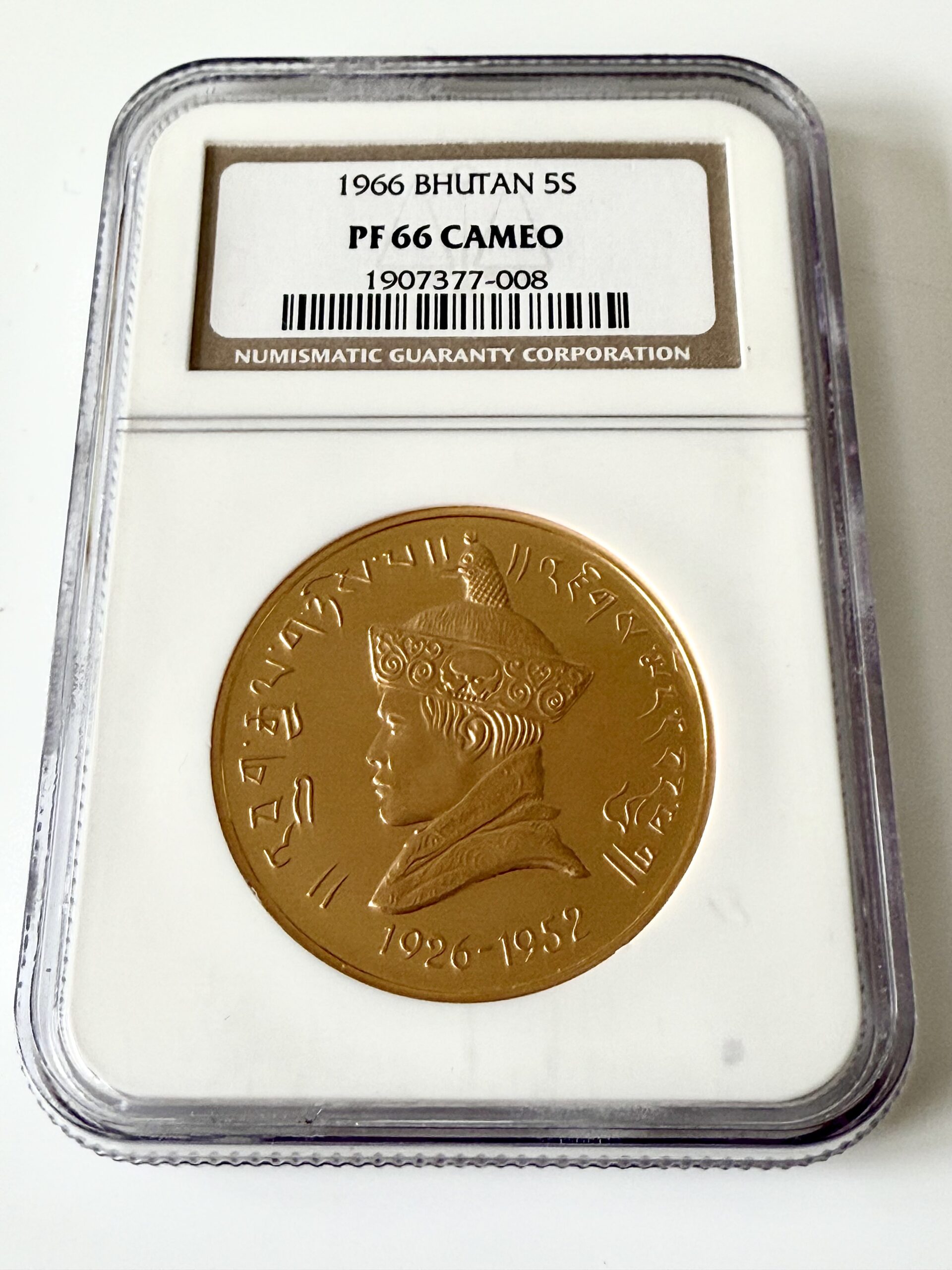 不丹 – 1966 – 5 Sertum – 吉美旺色 – 登基40周年 – NGC PF66 Cameo